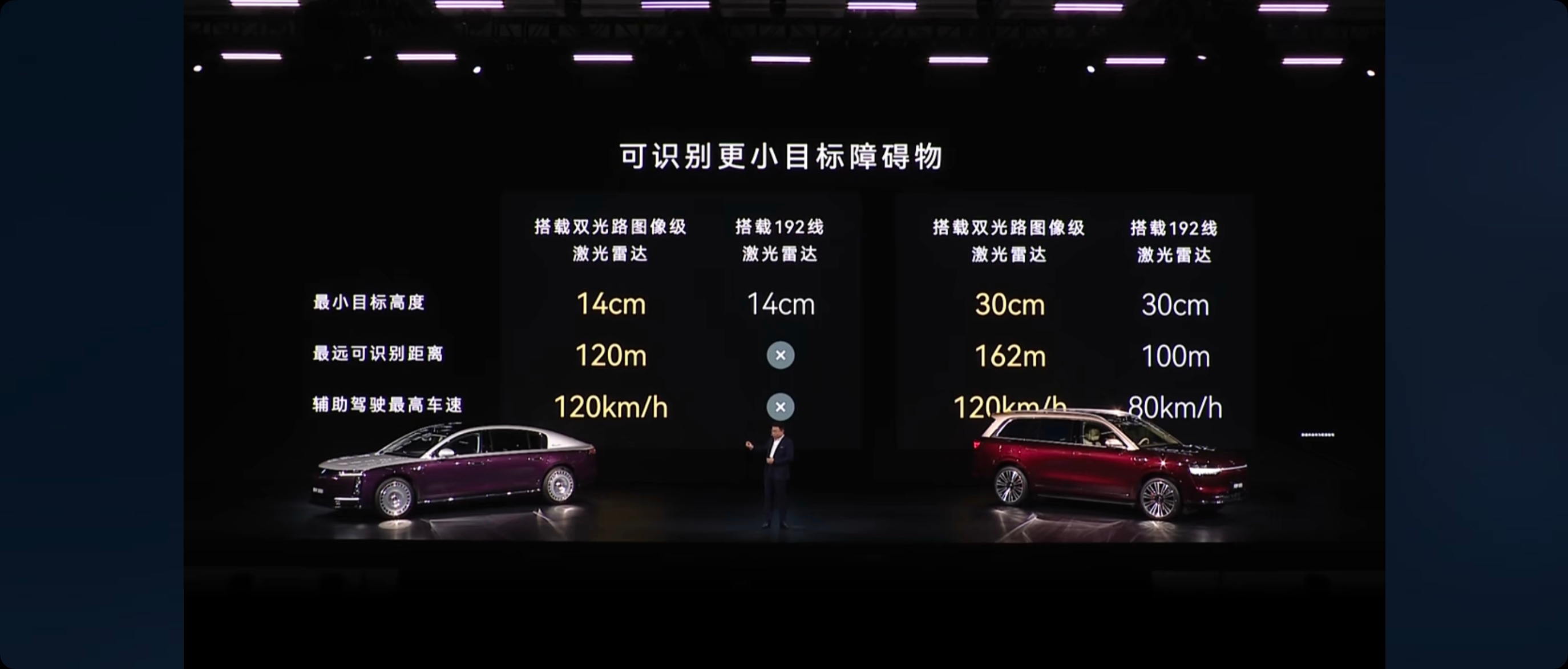 128线激光雷达要成过去?尊界S800首发搭载全球量产最高规格新一代双光路图像级激光雷达,带来896线激光雷达,做到超高清、超精准、超远距。尤其是对小目标、低反射率与异型障碍物感知距离再攀新高。可远距离识别14cm高度物体,倒地轮胎等低反射率目标感知识别距离提升190%,横倒锥桶等异型障碍物感知识别距离提升77%,守护全场景安全。安全背后有乾崑 尊界首搭双光路图像级激光雷达