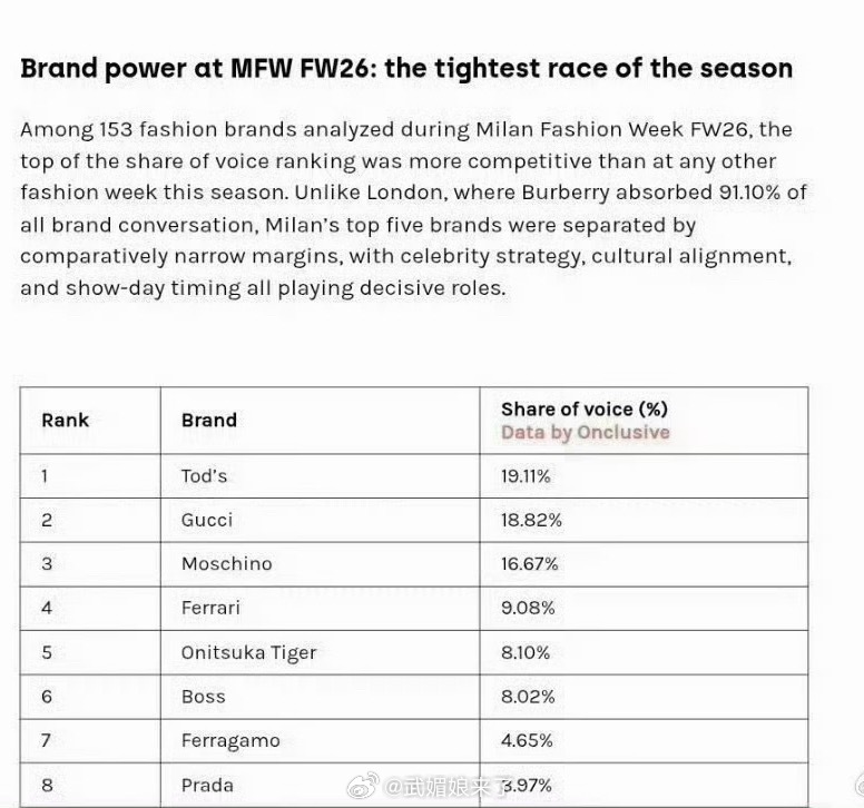 2026米兰时装周品牌影响力排名肖战代言的Tod's和Gucci拿下第一第二签了肖战直接就是躺赢了