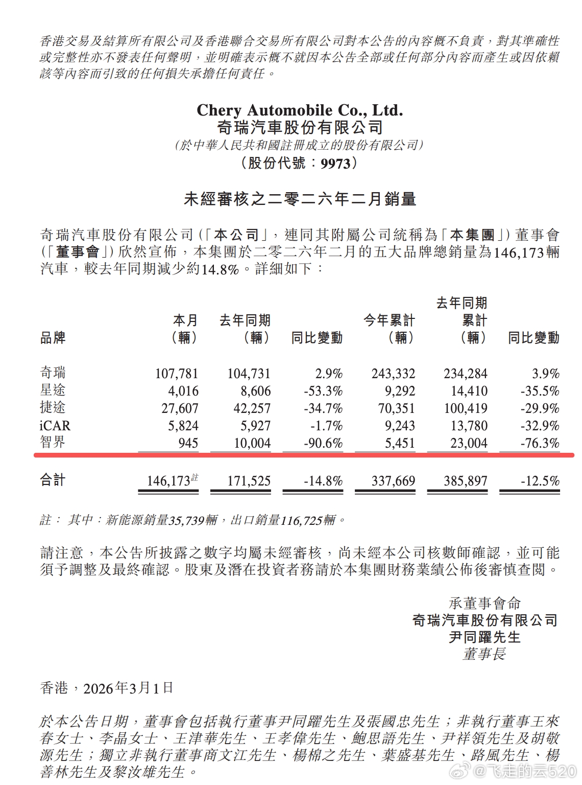 945销量数据来自:奇瑞汽车股份有限公司在港交所发布的二月份销量公告