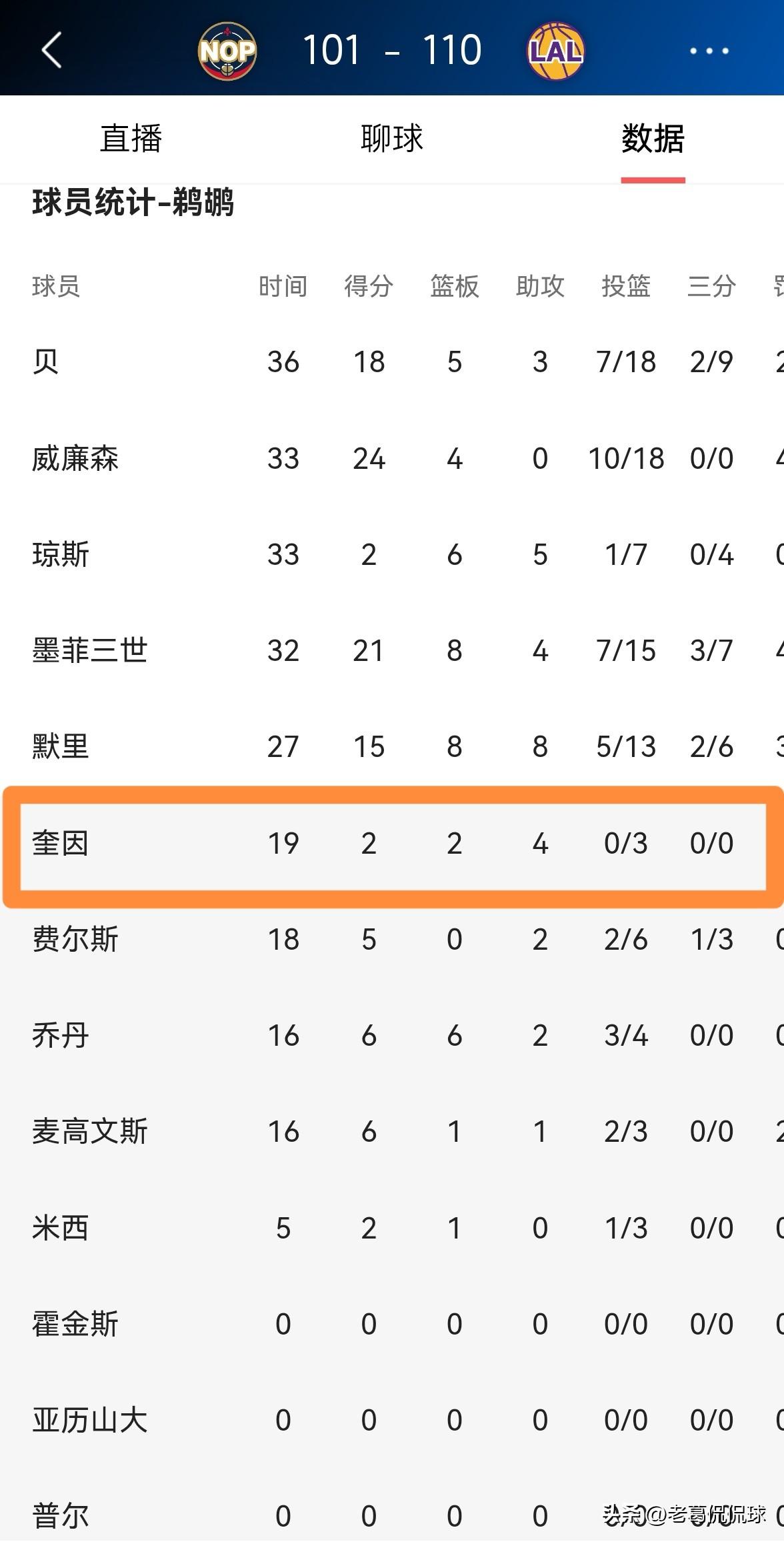 鹈鹕天才中锋奎因真是黯然失色!在今天鹈鹕客场以101:110不敌湖人的比赛中,奎因的表现非常的糟糕,他在篮下的表现更是惨不忍睹。 全场比赛下来,奎因替补出战19分钟,投篮3中0依靠罚球得到2分,仅仅抢到了2个篮板,还有2次失误和4次犯规。 虽然奎因拥有极高的篮球天赋,但是本场比赛奎因确实是黯然失色,他在攻防两端都没有打出应有的表现。