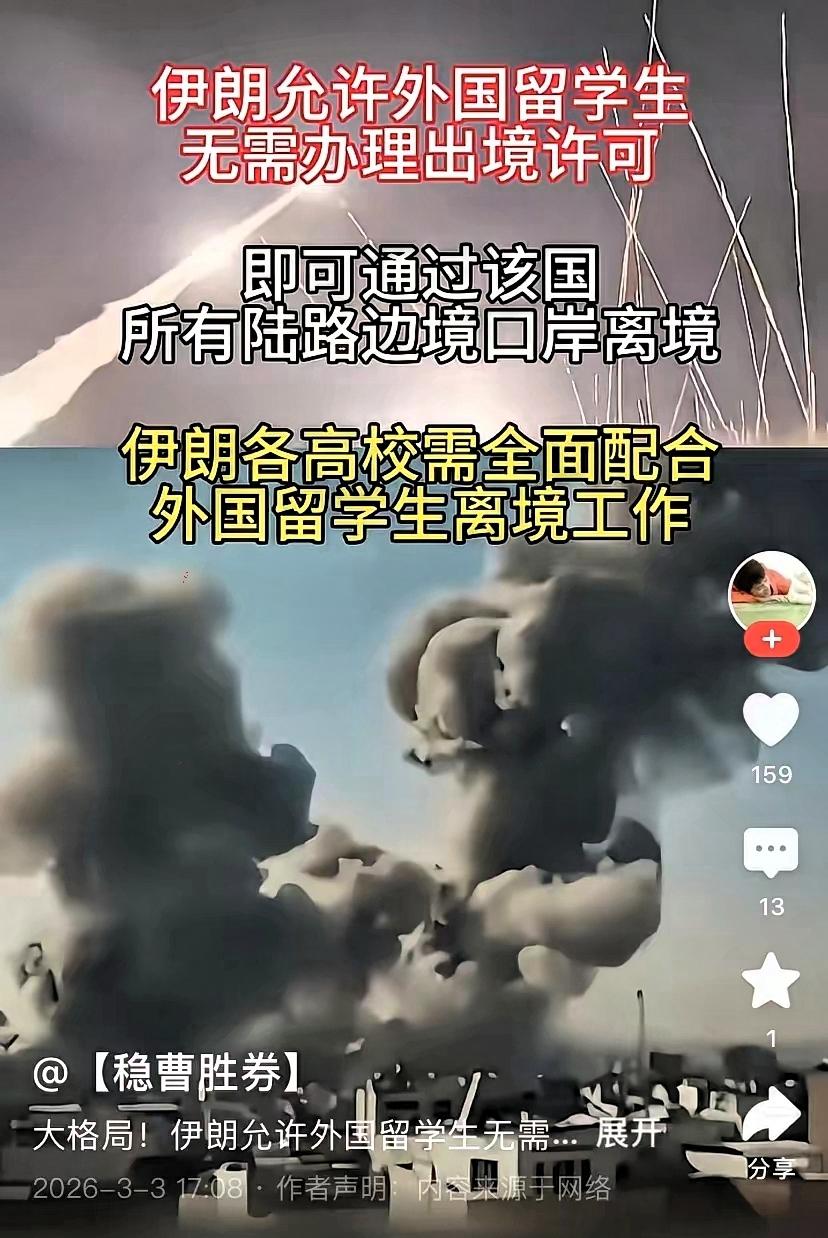 网友爆料称:美以斩首开战后,伊朗允许外国留学生,无需办理出境许可,即可通过该国所有陆路边境口岸离境,伊朗各高校需全面配合外国留学生离境工作........ 战火当前,很多国家都会优先保障自身安全,甚至会用各种手续限制人员流动,可伊朗没有把留学生当“肉盾”,反而主动打开绿色通道,尽最大努力帮大家安全撤离。不添堵、不刁难,在自身面临巨大压力时,还能顾全外国学子的安危,这份担当既悲壮又让人动容。