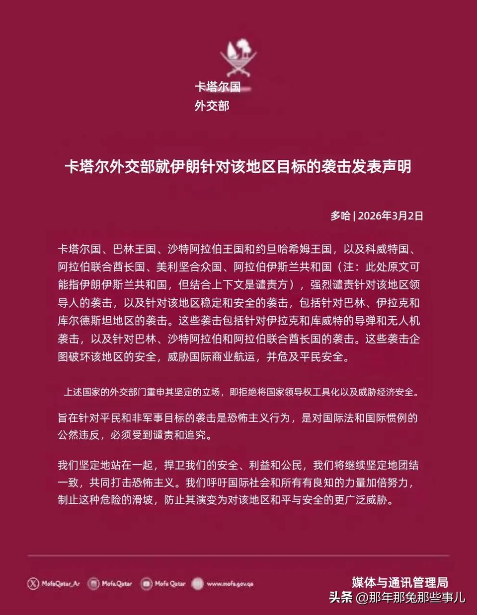 这下轮到老美谴责了.. 这公告刚发出去几分钟,卡塔尔又喜提十枚大火箭,然后就没下文了。 接受美国驻军的时候就该想到今天了,既要老美保护你,又要老美挨揍时不波及你,哪那么好的事儿? 老美也是搞笑,把最想谈的一锅端了,让最想打的上台了... “你的领土为什么要让美国佬驻军?” “没美国驻军我就不打你了啊”