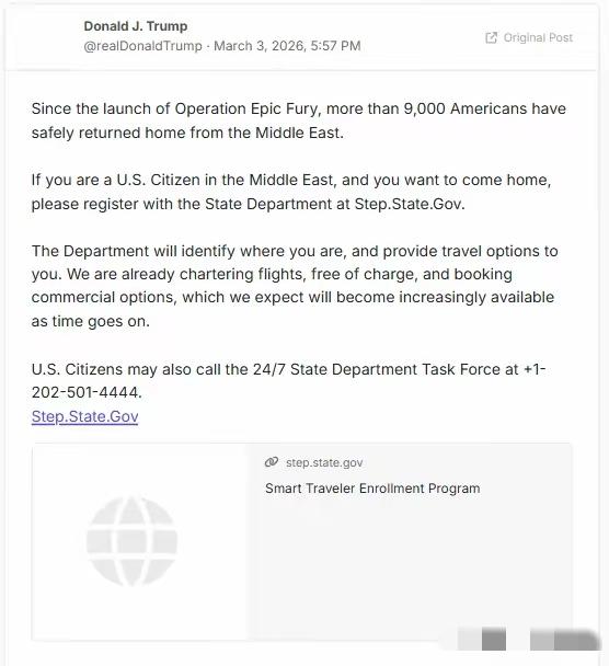 特朗普美东时间3月3日下午5时47分发帖称:自“史诗狂怒行动”启动以来,已有超过9000名美国人安全从中东返回家乡。如果您是在中东的美国公民,并且想回国,请在线向国务院注册。国务院会识别你的所在地,并为你提供出行选择。我们已经免费包机,并预订商业航班选项,预计随着时间推移,这些选项会越来越多。 这条发帖精准卡在伊朗对美军基地实施反击的关键节点,表面是通报撤侨进展,实则是用数据安抚国内恐慌情绪,掩盖中东局势持续升级的现实。 美国国务院公开数据显示,当前滞留在中东的美国公民接近3万人,分布在黎巴嫩、沙特、科威特、伊拉克等16个高风险国家及地区,9000人的返乡规模,仅占总滞留人数的三成,远未达到全面撤离的标准。 我查阅到撤侨人员的具体构成,这9000人里,近七成是美国驻中东使馆工作人员、军方家属、能源企业高管与高薪技术人员,真正在当地从事教育、餐饮、零售、志愿服务的普通平民,能登上撤侨航班的不足2700人。 48岁的罗伯特在黎巴嫩贝鲁特担任中学教师,已经在当地生活15年,冲突爆发后他第一时间完成在线注册,连续四天刷新页面都没有收到登机通知。 他的学生大多来自当地普通家庭,每天都能听到窗外的爆炸声,他想带着妻女返回芝加哥老家,却只能在使馆外的长队里反复等待,免费包机的名额,从来不会优先分配给像他这样的基层工作者。 29岁的索菲亚是沙特阿美石油公司的普通文员,她的父母住在休斯顿,得知中东局势恶化后,每天都催促她尽快回国。她尝试预订商业航班,发现票价已经暴涨至平时的11倍,单程经济舱票价超过4500美元,这笔钱相当于她三个月的工资。 美国国务院的在线注册系统多次出现崩溃,中东部分地区网络信号不稳定,不少偏远地区的美国公民连完成信息登记都做不到,所谓的定位与出行匹配,在现实面前根本无法落地。 中东多国已经关闭领空,迪拜、利雅得等区域航空枢纽的航班大幅缩减,美国政府所谓的免费包机,每日仅开行6架次,且起降点集中在安全区域的大型机场,身处伊拉克、叙利亚边境的美国公民,根本无法安全抵达登机点。 美国驻科威特、沙特使馆已因袭击临时关闭,领事服务全面暂停,普通公民遇到紧急情况,连咨询渠道都找不到,只能自行承担风险。 特朗普口中不断增加的出行选项,更像是为富裕群体预留的通道。商业航班的稀缺座位被高价竞拍,只有经济条件优渥的家庭才能承担天价机票,低收入平民只能被迫滞留。美国政府没有出台票价管控措施,也没有为困境公民提供紧急交通补贴,撤侨行动从一开始就被划清了阶层界限。 2021年阿富汗撤侨的混乱还历历在目,大量平民与盟友滞留机场引发伤亡,这次中东撤侨,美国政府依旧把特权群体放在首位,普通公民的生命安全,在政治宣传面前被不断弱化。 “史诗狂怒行动”的核心目标是军事打击,撤侨只是配套的舆论操作,白宫需要用亮眼的数据,向选民证明政府在有效保护海外公民,转移军事行动带来的国内压力。 普通美国公民的真实处境,远比发帖内容艰难。他们有的丢失了行李与证件,有的面临药品短缺,有的担心住所被波及,却只能在焦虑中等待遥遥无期的撤离通知。 免费包机的承诺难以兑现,商业选项的门槛高不可攀,所谓的全面保障,更像是一场精心包装的政治表演。 海外公民的安全保障,从来不是靠社交媒体上的话术支撑,需要的是覆盖全员的执行方案、公平的资源分配、务实的救援行动。当撤侨变成阶层筛选的工具,当普通民众被排除在优先保障之外,再华丽的宣传,也无法掩盖行动中的不公与缺位。 各位读者你们怎么看?欢迎在评论区讨论。