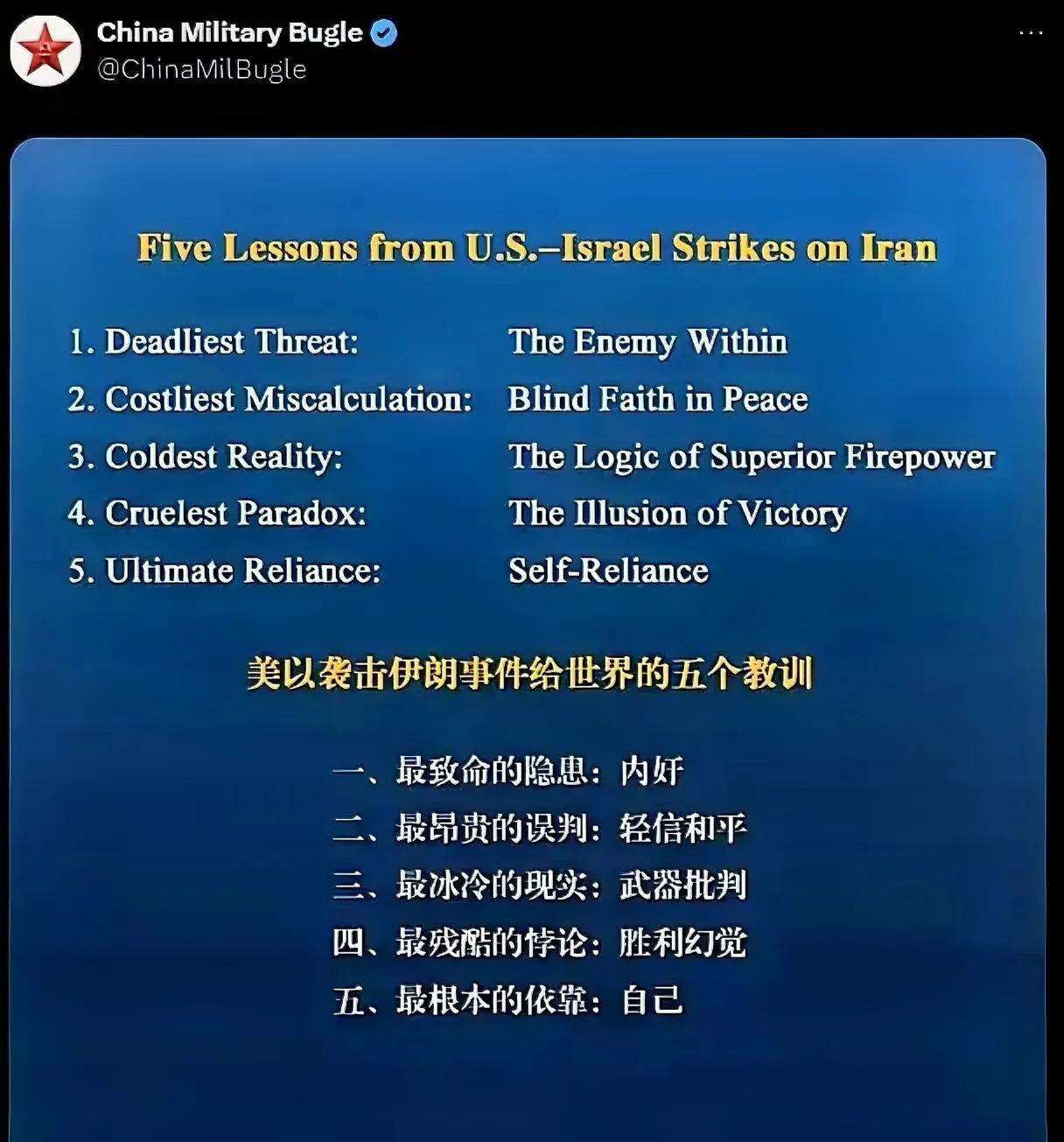 中国军号发推文:五个教训 中国军号3月3日在社交平台X上用中英双语发布《美以袭击伊朗事件给世界的五个教训》: 一、最致命的隐患:内奸 二、最昂贵的误判:轻信和平 三、最冰冷的现实:武器批判 四、最残酷的悖论:胜利幻觉 五、最根本的依靠:自己 前三个给伊朗看, 给伊朗敲警钟 最致命的隐患往往不是外敌,而是家门前的内奸。 最昂贵的代价不是战争,而是轻信了和平的天真。 最冰冷的现实是:光靠嘴批判换不来安宁,能捍卫尊严的只有手里的武器。 第四条给美国人看 所谓的“胜利幻觉”,不过是杀鸡儆猴的假象。战术赢了一时,战略输了长远,反噬迟早找上门! 第五条给全世界看 打铁还需自身硬!在这个弱肉强食的世界里,靠谁都不如靠自己。没有强大的国防做底气,一切都是空谈! 国家越来越强,就是因为我们时刻保持着这种清醒与警惕!🇨🇳