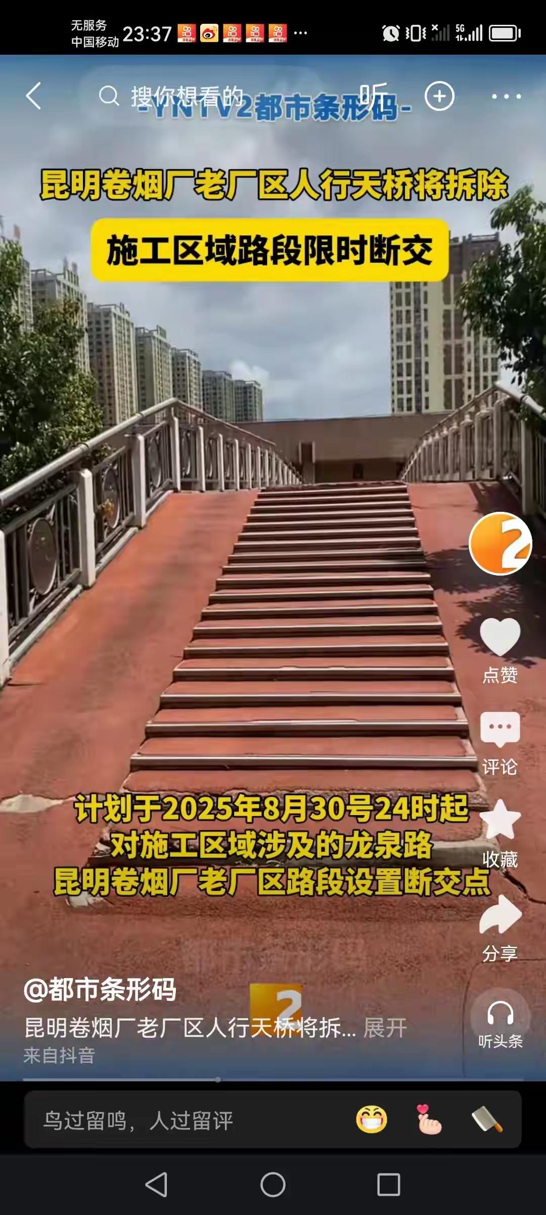 龙泉路上昆八中门口即将新建一座人行天桥,与对面的万科中天北宸小区连接。 在龙泉路上,以前2011年其实就拆除了一座天桥了,当时给出的理由是北三环的修建需要。又在2025年9月1号对龙泉路昆明烟厂旁边的那座天桥又拆除了。说真的,昆明烟厂这座天桥还走过很多次呢!希望以后提前规划好,拆除了多可惜,建要一笔钱,拆除也是要一笔钱,主要是拆除了真心的不方便,不喜欢!