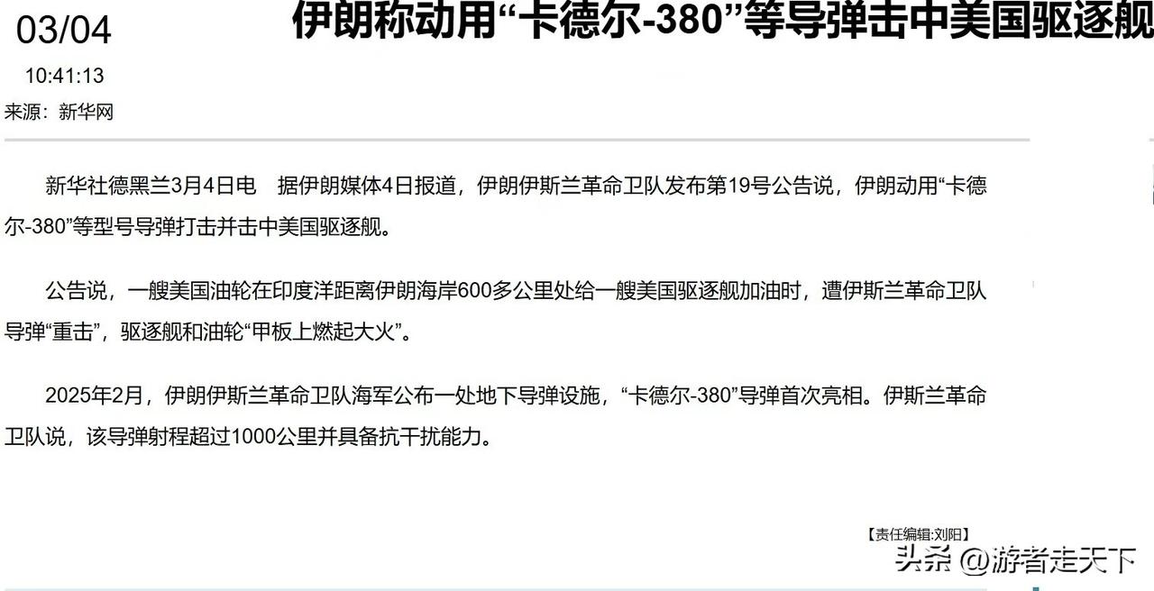 伊朗采用克德尔-380等导弹击中美国的驱逐舰,重点不是击中,而是这艘美国军舰距离伊朗海岸线600多公里。 这说明: 1,伊朗有能力监控至少600公里以外的目标。 2,美国和以色列进攻这几天来,没有破坏伊朗的探测系统,让伊朗对周边依然有极强的探测能力。 3,美国和以色列把伊朗渗透的这么深入,竟然对伊朗的武器装备性能还摸不准,所以它在距离伊朗导弹的射程之内加油玩。 4,美军驱逐舰的宙斯盾系统并没有吹嘘的那么厉害,防御水平有待提高。 5,伊朗具备自行研发和生产远程反舰导弹能力,而且导弹的技术水平还不错。 6,美军对这次战争的准备不足,按说美军驱逐舰续航能力大约为8000公里,开战这么几天就开始加油,说明很可能美军方面以为这场仗几天就打完了,就没提前加满油。 7,既然600公里都不安全,美军航母舰载机只能借助于加油机的帮助来作战了。F-18作战半径是800公里,美军航母再往后撤,就要超过F-18的作战半径了。 写在最后:伊朗这次击中美军驱逐舰,无论是战术还是战略角度,都是一个比较大的胜利。