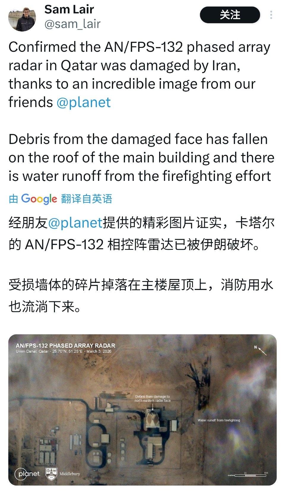 卫星图拍到了关键一幕:卡塔尔乌代德空军基地那座价值11亿美元的“铺路爪”雷达,被伊朗导弹炸了。 这座雷达的正式编号是AN/FPS-132。卡塔尔当年通过美国对外军售渠道买下这套系统,花了大约11亿。雷达楼有将近13层楼高,采用固定式相控阵体制,三个阵面各负责120度,能实现360度无死角探测。最大探测距离5000公里,主要盯着伊朗方向,为美军提供弹道导弹的早期预警和中段反导跟踪数据。它是美军全球导弹预警网在中东的核心节点,跟格陵兰、英国的那些雷达站是同一级别的存在。 因为辐射太强,这座雷达建在人烟稀少的地区,上空还划了限航区,飞机得绕着走。 现在它面向伊朗的那个东北阵面被毁了。 卫星图像是3月3日到4日拍的,Planet Labs的高清图上能清楚看到,雷达阵面的墙体碎裂,碎片散落在主体建筑的屋顶上,周围有大片消防水渍延展开去。《纽约时报》的分析说,碎片分布和焦土痕迹都符合弹道导弹直接命中的特征。 打击发生在2月28日傍晚到3月1日凌晨,是伊朗“真实承诺-4”反击行动的一部分。据分析,伊朗先用“沙赫德-136”这类低成本无人机去消耗美军的防空弹药,等“爱国者”系统忙着对付无人机的时候,再用“法塔赫-2”高超音速导弹钻进去,精准打掉雷达。 这套打法成本极低。无人机几万美元一架,导弹几百万美元一枚,加起来不到一千万,换掉的是11亿美元的雷达。美军的静态防御体系在饱和攻击面前,脆弱性暴露得很彻底。 现在双方对损毁程度各说各话。 伊朗那边高调宣传,说摧毁了“美军中东之眼”,还拿出卫星图像当证据。独立分析也认为,东北阵面完全失效,内部电子设备损毁,维修成本可能超过4亿美元。相控阵雷达一个阵面坏了,就意味着120度探测盲区,原本来能覆盖伊朗全境、中亚和印度洋的预警范围,现在缺了一大块。 美军和卡塔尔那边口径比较收。五角大楼没直接确认,只说“设施受损不影响防御”。卡塔尔官方承认导弹击中了基地,但强调损失不严重,拦截了一部分。 技术上说,这座雷达的探测距离5000公里,原本能为“萨德”和“爱国者”提供15到30分钟的预警时间。现在这个窗口被压缩到2分钟左右。美军在中东的反导网,等于被撕开一道口子。 更麻烦的是,这种雷达全球只有6部,生产周期要一两年,短期内补不上。而伊朗那边,导弹还在继续打。美国雷达 无人机探测雷达 卡塔尔空袭 中美俄雷达 雷达导弹