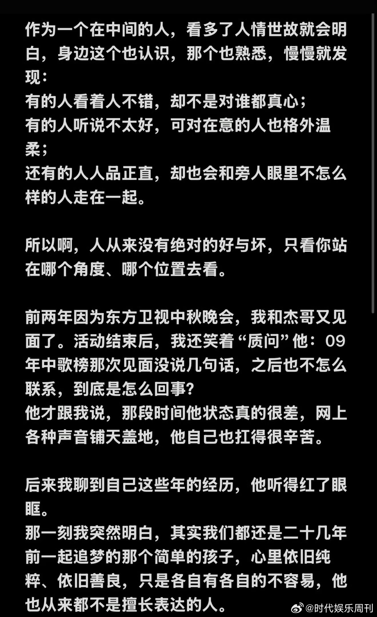 时间沉淀下来的了解,比任何即时的声援都更有分量。为这份跨越了漫长时光的友情与信任感动。魏佳庆为张杰发声