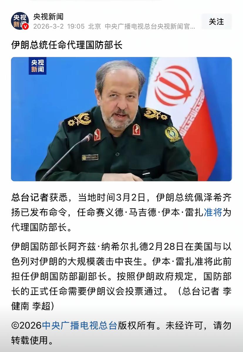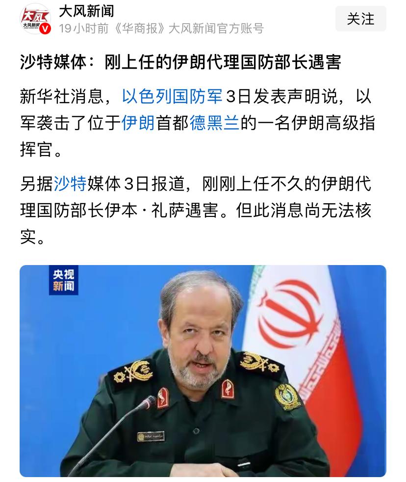 伊朗新任国防部长任命24小时内被斩首,伊朗高官都是高危岗位,下一个副部长瑟瑟发抖中 伊朗连失多员大将,指挥打仗的国防部长被斩首后,伊朗总统临时任命国防副部长代理,谁知上任没有24小时就被斩首,对方的精准打击让伊朗军方高层比较恐慌,谁露头就打谁,伊朗下一任部长肯定也是临时上任,副部长替补,下一个估计在颤抖中。 对方不得不服,孙子兵法用的好,擒贼先擒王,先把对方军心搞乱,剩下的都好收拾。