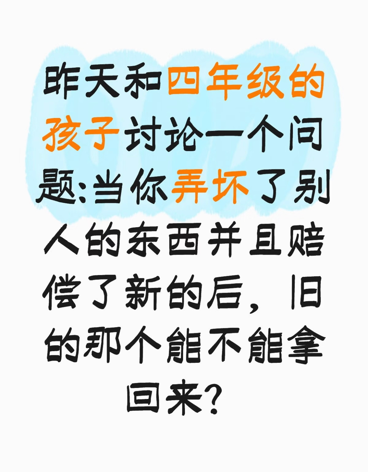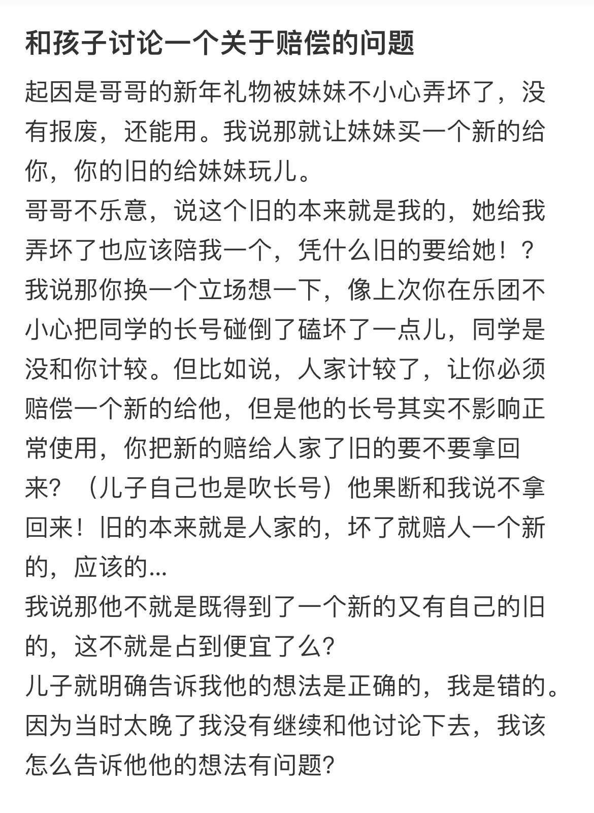 和孩子讨论一个关于赔偿的问题。