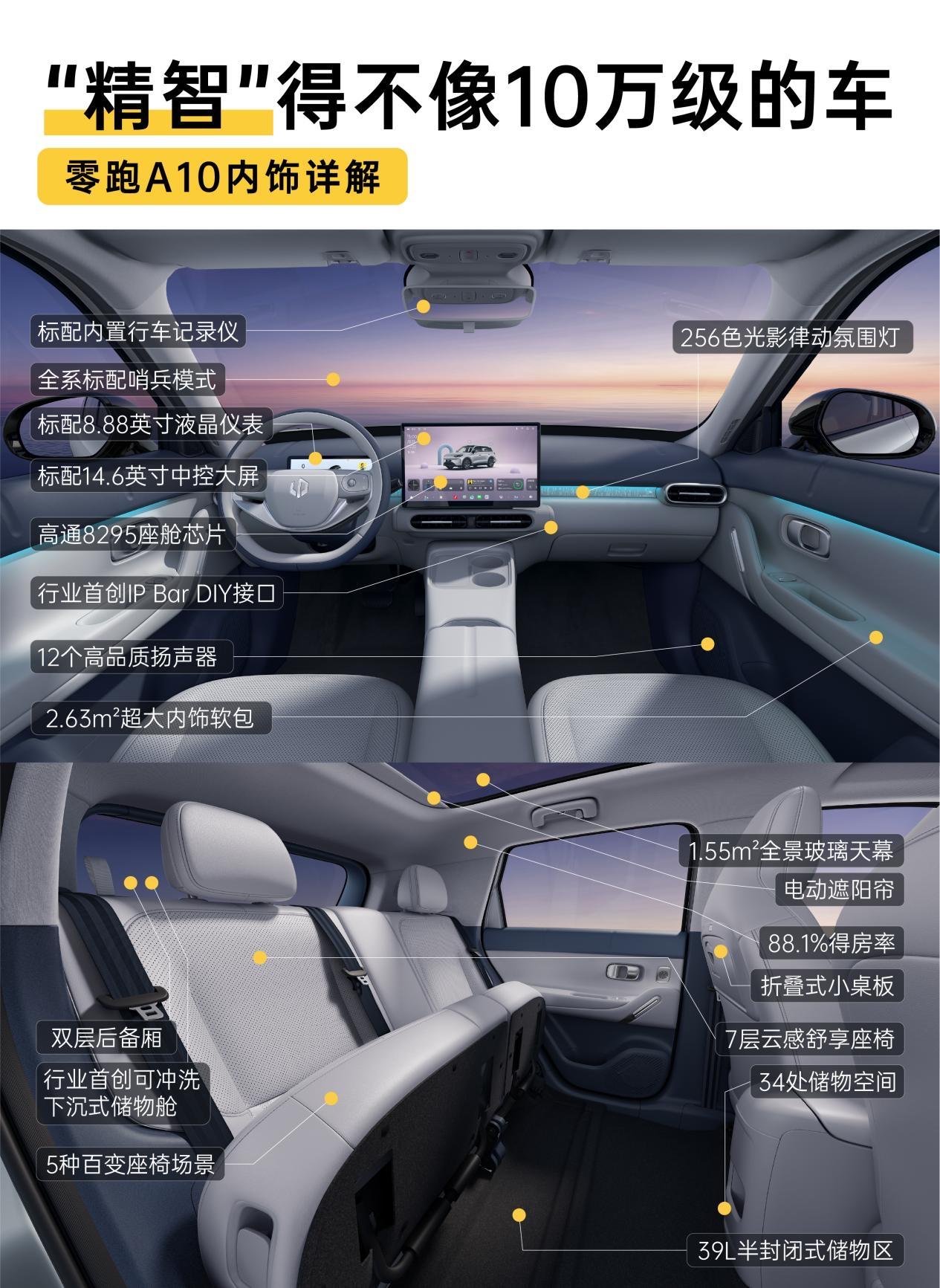 准A级车跟Model Y比空间?零跑A10还真没输 是的,你没看错,这里谈的准A级车空间确实可以跟B级车空间相争,这不是倒反天罡,而是真实发生在零跑A10身上的事儿。 零跑A10是一款A级SUV,车长还不到4点3米,轴距也是刚刚的超过2.6米,确做到了88.1%的空间得房率,作为参考,Model Y得房率约70%,因此Model Y尽管尺寸更长,实际空间也很大,但零跑A10空间也不容小觑,后备厢常规容积602L,放倒后排更是能达到1549L,实测放下了12件大家电,包括洗衣机、油烟机等,装修新家,它也能帮上忙。 空间细节更贴心。后排有折叠小桌板,带孩子出门临时泡个奶、吃个零食,方便得很。座椅可以上翻,下面藏着39L储物格,放宠物正合适,它们有活动空间,还不会踩脏座椅。 最绝的是后备箱那个106L下沉式可冲洗舱。钓完鱼回来,活鱼直接放里面,不怕腥味窜到车厢。脏鞋子、湿衣服也往里扔,到家水一冲就干净。 由此可见,零跑A10虽是小型SUV身材,但空间妥妥是越级水平,据说价格可能在10万内,还带激光雷达和车位到车位辅助驾驶。如果真是这样,2026年纯电SUV市场,A10绝对值得期待。3月26号预售,坐等价格。造车新势力零跑汽车零跑A10特斯拉Model Y