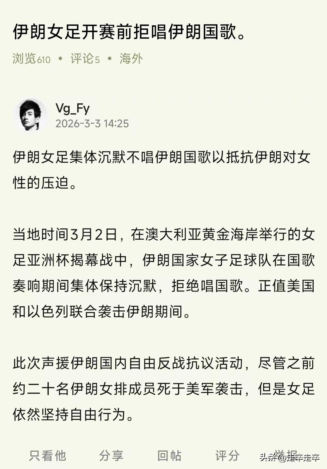 这事有些诡异哦。 3月2日于澳大利亚黄金海岸举行的女足亚洲杯揭幕战(伊朗vs韩国)赛前,伊朗国歌奏响时,场上11名头戴头巾的球员与替补席全员紧闭双唇,无人开口演唱国歌。 各位网友众说纷纭,①有认为是对国内性别压迫的持续抗争。伊朗女足长期受强制头巾制度束缚,球员出国比赛需丈夫书面同意,11年曾因头巾问题被取消奥运资格。此次沉默被部分视为对宗教高压政策的挑战。②有网友认为是球员在国家哀悼期遵守伊斯兰教义,伊斯兰教义规定最高领袖去世的哀悼期内禁止歌唱,包括国歌。球员的沉默可能符合宗教规范,而非政治抗议。③更有甚者质疑球员在美以军事打击、国家存亡关头忽视民族危难。球员们在国外比赛已经是最安全的环境了,不好好打比赛,提振一下战乱中老百姓的心气,一起抗击外敌。反而拒唱国歌,这是正常人能干出来的事情? 在我个人看来这就是伊朗在被美 以侵略后世界上各大国只是在道义上进行谴责而却没有伸出实质上的援手的主要因素。一个以宗教治国的神权政府内部深层次的分裂,外人再是想尽办法也不能解决他们人民团结的问题。治国不能只有信仰更需要面包。