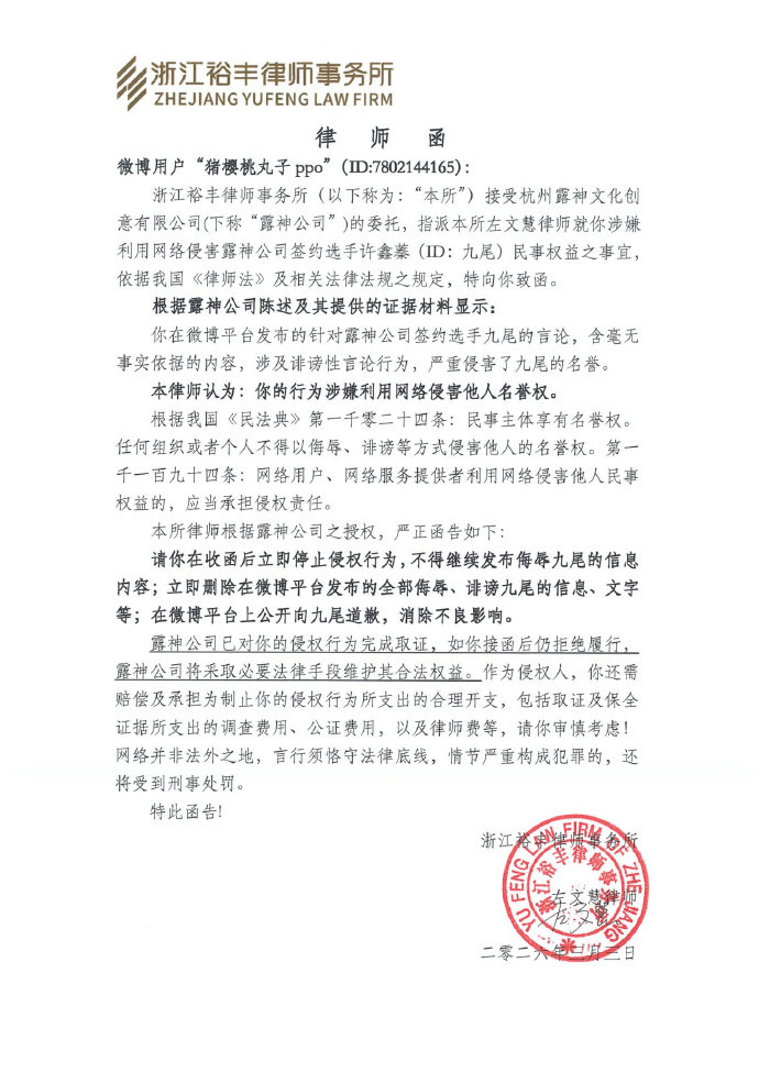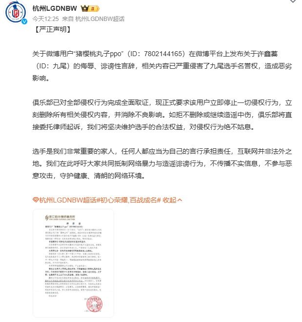 硬核维权!LGD.NBW 俱乐部今日发布严正声明,针对近期网络上对九尾选手的侮辱与诽谤,目前已完成全面取证,正式开启法律诉讼程序!