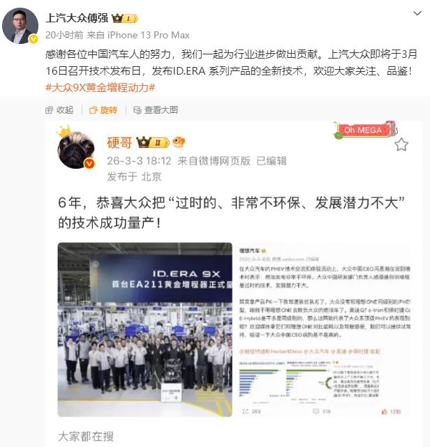上汽大众是会蹭流量的 理想汽车高管反讽,大众终于把增程技术量产 上汽大众高管随后转发配文 3月16日将会发布ID.ERA 系列全新技术 其实就是在为大众ID.ERA 9X上市预热 而大众ID.ERA 9X将会搭载大众首款增程动力 大众曾经吐槽增程是落后的技术 现在来看,不管增程是不是落后 它确确实实受到了市场欢迎 以大众在发动机领域的积累 而且还是用经典机型EA2111研发 相信这台发动机效率不会差 期待9X的真实表现