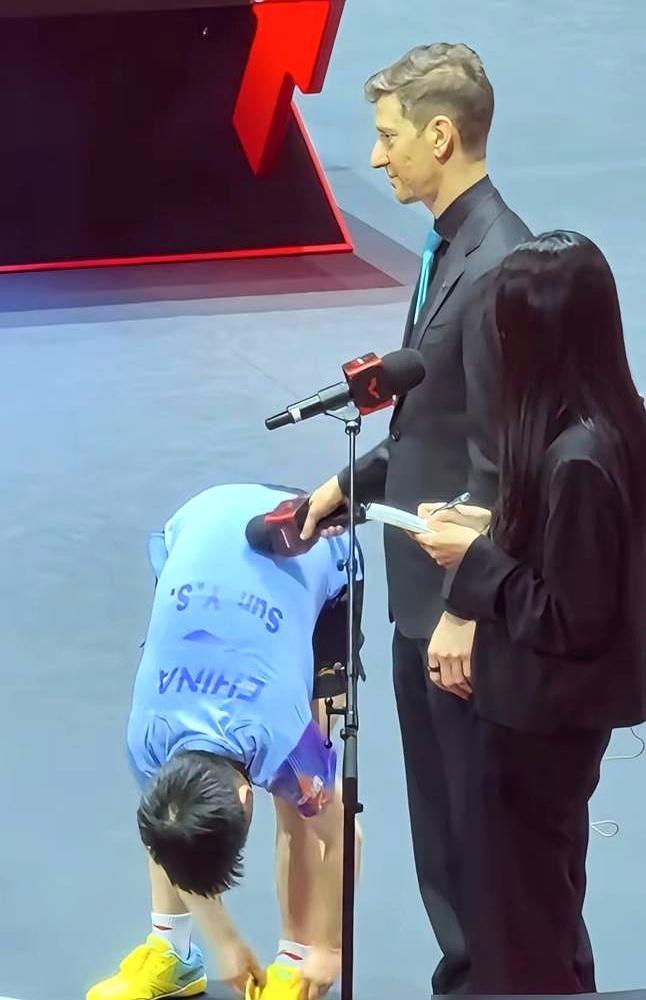 她蹲下系鞋带,腰上突然被话筒轻轻戳了一下。 抬头一看,是那个总在镜头后为她握拳的老外亚当。11比2碾压首局时他没戳,14比12咬下关键分时他没戳,偏偏选这个全世界都看不见她表情的瞬间。三年前他第一次用中文替她解围时,她就知道——有些朋友不需要语言。 竞技场用比分丈量一切,但真正穿透国界的从来不是记分牌。是解说席上突然切换的中文,是局间休息时推过来的水瓶,是明知镜头拍不到却依然蹲下的等待。 顶级运动员的孤独像真空舱,而善意是唯一能穿透舱壁的氧气。亚当这一戳戳破的何止是采访流程,那是把“对手”戳成“队友”,把“国际礼仪”戳成“自家玩笑”。你看,人类最高级的共情从来不用翻译:当一个人愿意为你弯下腰,全世界都会跟着蹲下来。
