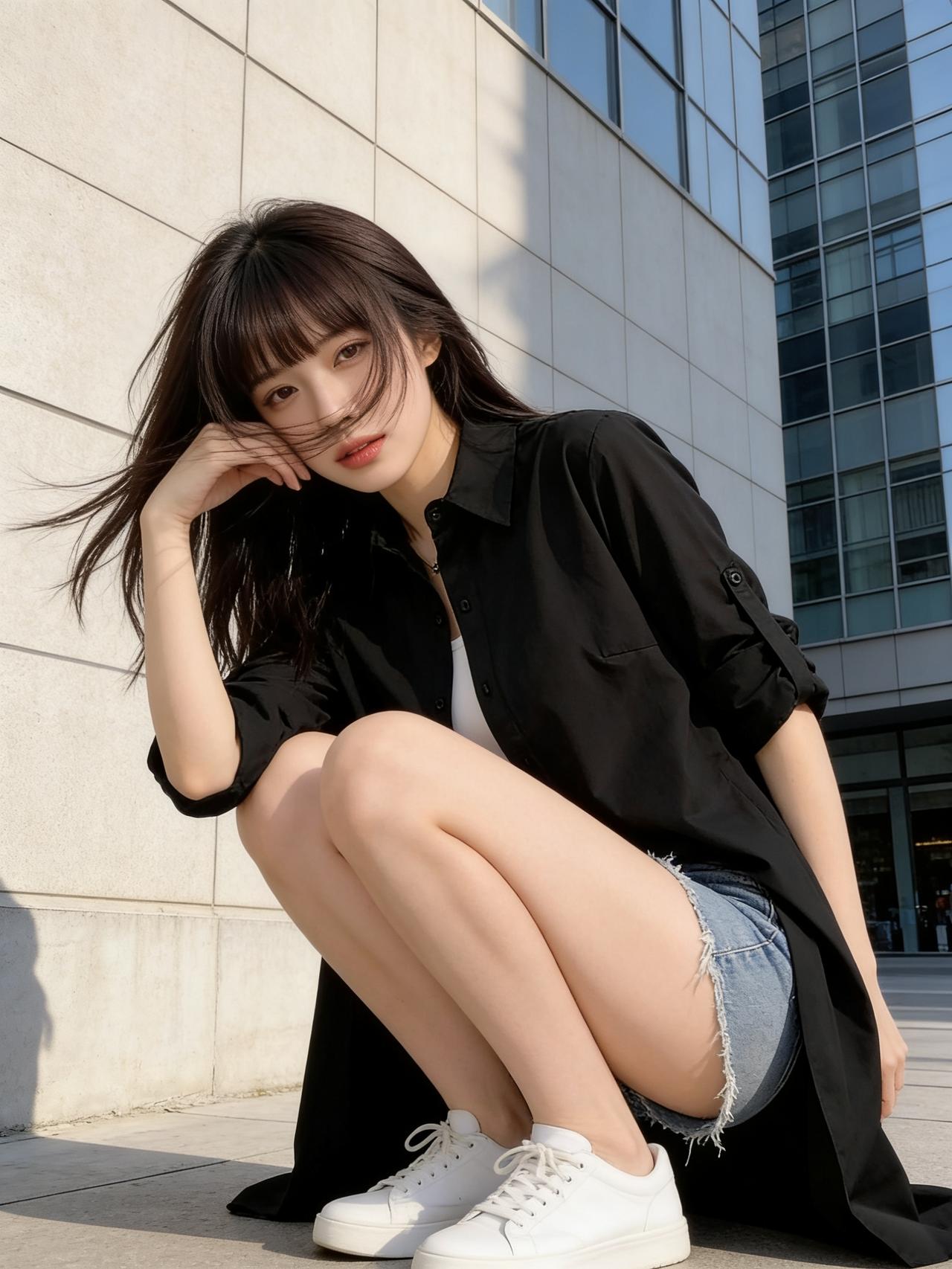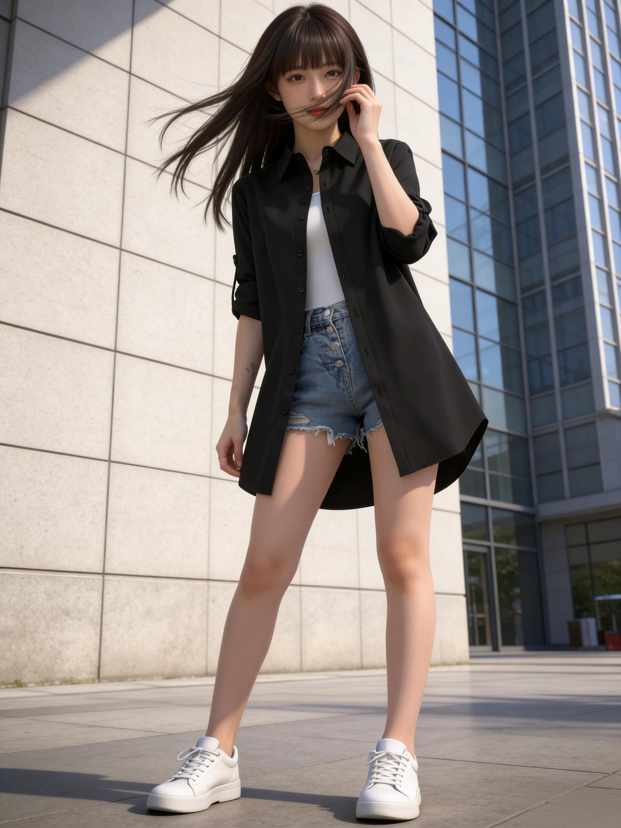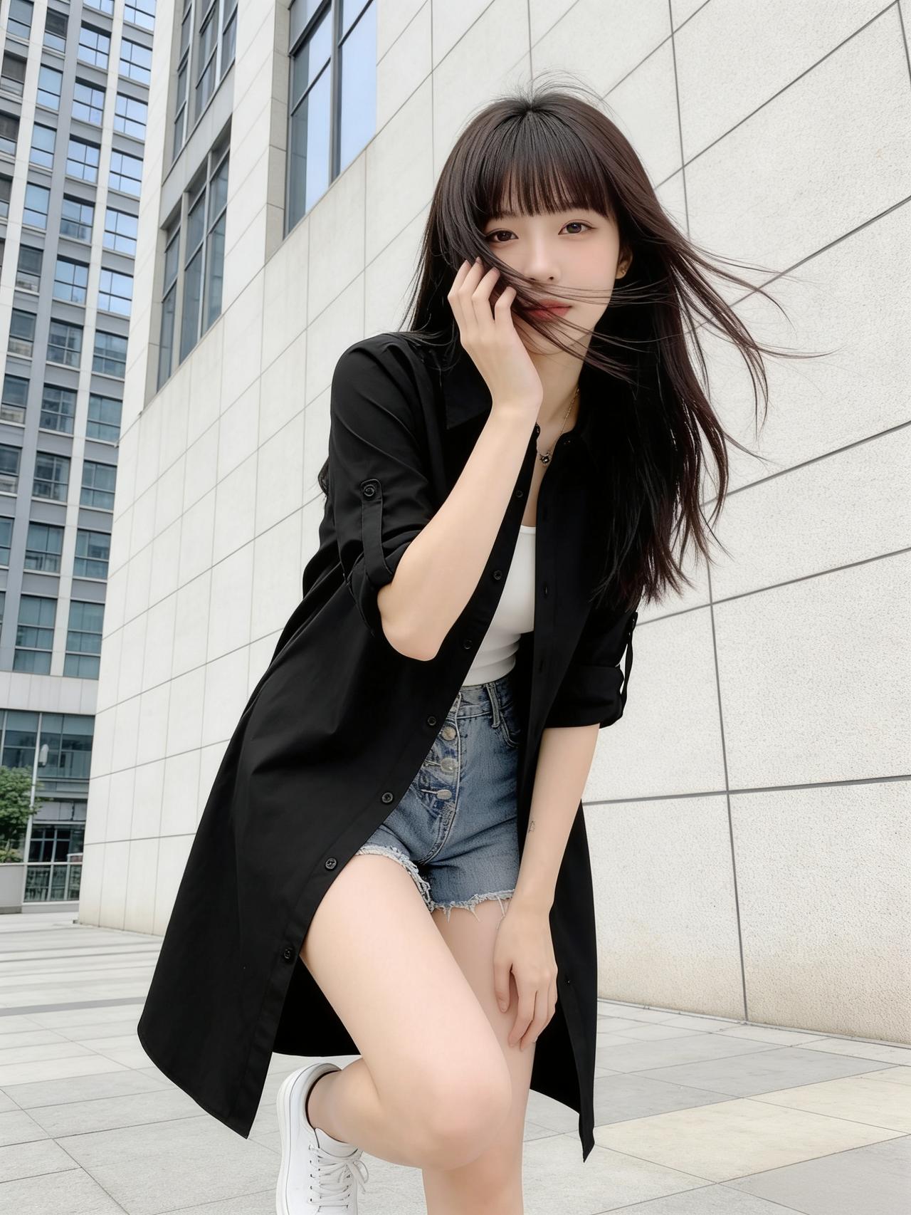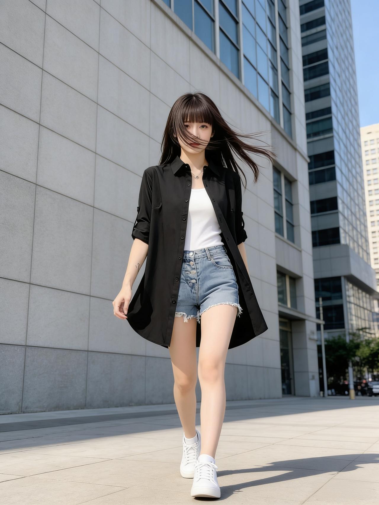 春风拂面,少女以一身时尚穿搭演绎温柔。白色T恤柔软亲腻,外搭黑色衬衫赋有青春活泼。下身搭配蓝色牛仔短裤,上衣垂坠,修饰腿型,利落又显高挑。脚踩白色小运动鞋,与开衫色彩呼应,简约却不失格调。她有着一头美丽的亮发,微风拂动发丝,气质氛围感拉满。整体配色干净柔和,不追逐浮夸设计,用基础款打造高级感,将舒适与时尚完美融合。行走间轻盈自在,像春日里的一缕清风,治愈又亮眼,诠释了松弛感穿搭的核心魅力。你喜欢吗?穿什么颜色的衣服显瘦 怎样搭配服装,更时尚、更靓丽? 怎么样搭配最显高级?