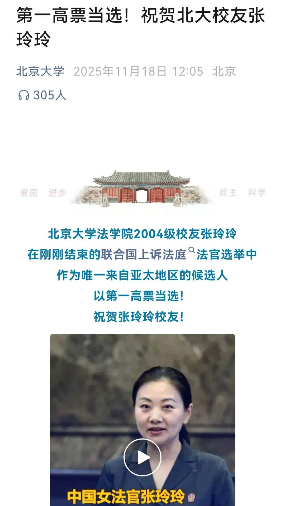 好消息传来!联合国正式向世界宣告:“中国人成功当选”! 2025年11月17日,第80届联合国大会上,中国法官张玲玲作为唯一来自亚太地区的候选人,成功当选联合国上诉法庭法官,任期整整七年 ,七年的任期,联合国把这么长的时间交给中国法官,这份信任沉甸甸的。 张玲玲这姑娘,那履历拿出来能吓你一跳,1981年出生的她,有着“英语+法律”的复合背景,本科读的是英语专业,后来跨专业考上北京大学法学院,一路读到中国人民大学知识产权法博士,还完成了博士后研究,这样的知识储备,让她在处理涉外案件和国际司法事务时,有着天然的优势。 在国内,张玲玲法官是最高人民法院的高级审判员,在民事审判领域深耕多年,专注于知识产权审判,参与审理过数千起各类案件,还执笔起草了多部司法解释,发表过60多篇法学论文和专著,是业内公认的“专家型法官”。 大家熟知的“琼瑶诉于正案”,她就是主审法官之一,正是这起案件,明确了影视行业抄袭的认定标准和侵权责任,为中国著作权保护树立了重要标杆,甚至被整理成专著,成为行业参考。 除此之外,在一起“平板拖把”专利侵权案中,她仅用26小时就作出行为保全裁定,促使13起关联案件自行和解,既体现了司法效率,也彰显了她的专业智慧。 这次联合国上诉法庭的选举,竞争异常激烈,一共有8名候选人角逐席位,而张玲玲是唯一来自亚太地区的代表,要经过简历初审、笔试、面试等多轮严格考核,最终在联合国大会上以127票的最高支持率成功当选,这份高票,就是国际社会对她专业能力、公正精神的最好认可。 要知道,联合国上诉法庭的法官任期长达七年,而且是兼职席位,每年还要赴纽约总部参加集中审理,这意味着她要同时兼顾国内和国际两份繁重的工作,但面对这份挑战,张玲玲笑着说“做难事必有所得”,这份担当,让人敬佩。 很多人可能会问,这只是一个法官的当选,为什么值得我们这么关注?其实背后的意义,远比我们想象的更深远。 第一,这是继2022年高晓力法官之后,中国法官连续第二位获任这一重要职位,说明中国司法的专业能力,正在被国际社会越来越认可。 第二,张玲玲作为亚太地区的唯一代表,她的当选,也能更好地反映亚太地区的司法诉求,让国际司法体系更加多元、包容。 第三,她能把中国司法实践中积累的“东方智慧”,比如调解优先、高效解纷的理念,带到国际舞台上,为全球司法治理注入中国力量。 面对即将到来的履职,张玲玲有着清晰的规划,她已经开始系统梳理联合国上诉法庭的既往判例,重点关注不同法律体系交锋下的裁判思路。 在接受采访时,她坦诚地说,来到联合国这个舞台,大家看到的不只是她个人,更是中国法官、中国法治的形象,她会始终以事实为依据、以法律为准绳,确保每一份判决都独立、公正。 她还提到,国内的司法实践能让她提出更接地气的解决方案,而国际履职的经验,也能反哺国内的司法研究,两者互补互促。 从一名普通法官,成长为登上国际司法舞台的佼佼者,张玲玲的经历告诉我们,人生没有白走的路,每一次努力和积累,都会成为未来的底气。 而她的当选,不仅是个人的荣誉,更是中国法治进步的缩影,是中国在国际舞台上话语权不断提升的体现。 未来七年,相信她会以专业和担当,在联合国上诉法庭上,展现中国法官的风采,为维护国际司法公正、推动全球法治建设,贡献属于中国的力量。 信息来源: 1. 新华社:《中国女法官张玲玲当选联合国上诉法庭法官》(2025年11月18日,记者潘云召) 2. 中国法院网:《对话张玲玲:国际司法舞台上的“新生”》(2026年3月3日)