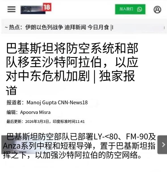 巴基斯坦下场了。 巴基斯坦把中械防空部队,LY-80,FM-90等装备开去沙特履行条约了。 这不是单纯的临时救场,而是巴基斯坦借着中械装备的硬实力,把欠沙特的人情转化成长期饭票的关键一步,中东王爷们的防务外包市场,这下算是被它摸到了门槛。 巴基斯坦和沙特的渊源,可不是一时半会儿的交情。巴基斯坦经济底子薄,2024-2025财年GDP才4110亿美元,人均刚过1800美元,外贸逆差常年维持在两百多亿美元,想维持六十多万的现役军队规模,单靠自己根本撑不住。 而沙特有的是钱,这些年给巴基斯坦的经济援助、能源支持和投资,早就成了巴方稳定经济的核心支柱。 从60年代开始,巴基斯坦就给沙特培训军人,累计超过8000人,两军的指挥体系、训练标准都高度兼容,上世纪80年代还曾有4万名巴基斯坦军人驻扎沙特,保卫王室和关键设施。 这种几十年的人员交流和利益捆绑,让双方形成了“沙特出钱,巴基斯坦出枪”的默契,这次出兵不过是把这种默契落到了实处。 这次派去的装备,LY-80是红旗-16的外贸版,采用垂直冷发射和相控阵雷达技术,抗干扰能力强,能同时应对多个空中目标,不管是战斗机、巡航导弹还是无人机都能打。 FM-90作为红旗-7的外贸版,是近程防空的好手,反应速度快,适合要地防空和伴随防空,刚好能补上沙特防空体系的短板。 沙特虽然有钱,买了美国的“萨德”“爱国者”,还订了俄罗斯的S-400,但这些装备要么偏重反导、防空能力不足,要么系统复杂、后勤麻烦,而且美俄装备之间互不兼容,形成不了合力。 而巴基斯坦带来的中械装备,不仅性能实用,还能快速融入作战体系,更重要的是巴基斯坦已经把这些装备用得炉火纯青,在和印度的对抗中积累了实战经验,57空战中零损失击落6架印度战机就是最好的证明。 沙特之所以愿意让巴基斯坦带着中械装备来,核心还是对美国的失望。长期以来沙特依赖美国的安全保护,但关键时刻总是掉链子。2025年9月以色列空袭卡塔尔,美国没采取任何实质行动,这让沙特彻底看清,美国的保护是有条件的,不能完全指望。 而巴基斯坦和沙特同为逊尼派国家,还有2025年9月签署的《战略共同防御协定》,明确规定任何针对一方的武装攻击都视为对双方的共同侵略,巴基斯坦甚至愿意为沙特提供核保护伞,这种承诺比美国的口头保证实在多了。 巴基斯坦心里也清楚,这是改变国家命运的好机会。中东防务市场是块肥肉,海湾国家每年在国防上的投入数以千亿计,但这些国家的军队战斗力堪忧,士兵娇生惯养,缺乏实战经验,根本扛不起复杂的防务任务。 而巴基斯坦军队常年处于战备状态,战斗力经过实战检验,还熟悉中东的地缘环境和宗教文化,正好能填补这个缺口。 这次带着中械装备逆行出兵,相当于一次实战展示,只要能在沙特站稳脚跟,用实力证明自己的价值,后续科威特、阿联酋等国的防务订单很可能会找上门来。 到时候巴基斯坦就不只是卖装备、派军队,而是能成为中东王爷家的“防务管家”,从装备维护、人员培训到实战部署全方位参与,这带来的经济收益可不是一笔小数目,能极大缓解国内的经济压力。 更妙的是,巴基斯坦还懂得平衡各方关系。出兵沙特的同时,并没有和伊朗彻底撕破脸,反而谴责美以对伊朗的非法袭击,既兑现了对沙特的同盟承诺,又避免了两面树敌。 而中国在这其中扮演的角色也很巧妙,没有直接介入中东纷争,而是通过巴基斯坦把中械装备和防务体系输出到中东,既避开了地缘风险,又提升了中械装备的国际认可度,形成了“中国出技术、巴基斯坦出人力、沙特出钱”的三方共赢模式。 对巴基斯坦来说,这不仅仅是还人情,更是一次战略转型。过去它的安全重心一直在印度,经济上依赖外援,这次借着中东的机会,既能开辟新的经济来源,又能提升国际影响力,从“南亚地区国家”向“有全球影响力的地区强国”迈进。 而对中东来说,巴基斯坦的介入打破了原来美俄主导的防务格局,提供了新的安全选择。王爷们不用再在美俄之间摇摆,也不用忍受大国的政治附加条件,花同样的钱能买到更实在的安全保障。 随着巴基斯坦在沙特的部署逐步展开,LY-80和FM-90的实战表现将成为关键。如果能有效应对胡塞武装的导弹威胁,甚至在防空反导中打出亮眼战绩,中械装备的口碑会进一步提升,巴基斯坦的“防务外包”生意也会越做越大。 未来的中东防务市场,很可能会形成美俄主导高端市场、巴基斯坦带着中械装备占据中端市场的格局,而巴基斯坦也将彻底摆脱“靠援助度日”的标签,成为真正的“中东防务新玩家”。 这步棋,巴基斯坦走得既稳妥又有远见,既还了人情,又抓住了改变命运的机会,不得不说,这波逆行操作确实高明。