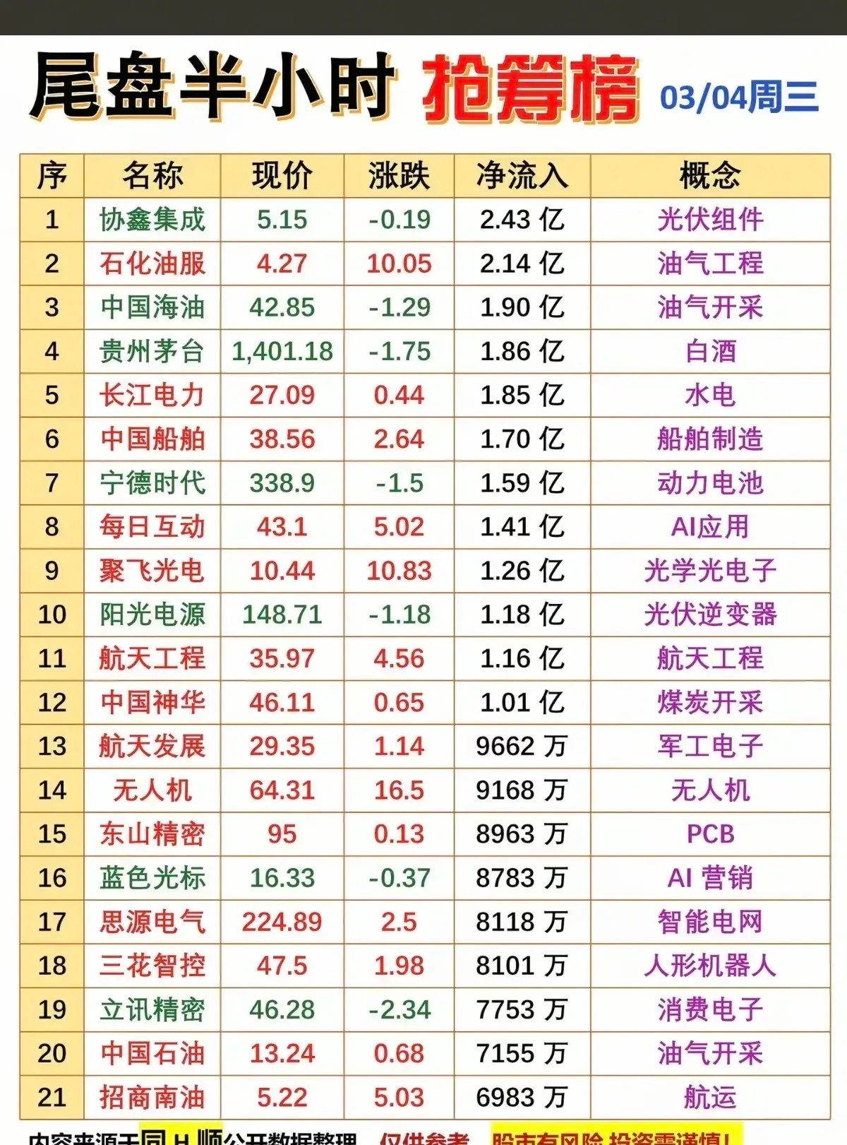 主力资金在光伏、油气、消费、科技、军工等多个板块布局。净流入规模从2.43亿到6983万不等,光伏组件、油气工程、油气开采等板块个股净流入居前,部分个股虽当日下跌但尾盘资金逆势流入,显示资金对相关板块的中长期关注度。个股梳理1. 协鑫集成:现价5.15元,当日跌0.19%,尾盘净流入2.43亿,属光伏组件板块。虽股价小幅回调,但尾盘资金大幅流入,主力对光伏组件赛道布局力度突出。2. 石化油服:现价4.27元,当日涨10.05%,尾盘净流入2.14亿,属油气工程板块。股价强势涨停,尾盘资金持续流入,油气工程板块热度较高,主力资金积极跟进。3. 中国海油:现价42.85元,当日跌1.29%,尾盘净流入1.90亿,属油气开采板块。股价小幅回调,尾盘资金逆势流入,油气开采板块获主力资金关注,布局意图明显。4. 贵州茅台:现价1401.18元,当日跌1.75%,尾盘净流入1.86亿,属白酒板块。股价小幅下跌,尾盘资金逆势流入,白酒龙头获资金青睐,消费板块配置价值凸显。5. 长江电力:现价27.09元,当日涨0.44%,尾盘净流入1.85亿,属水电板块。股价小幅上涨,尾盘资金持续流入,水电板块稳定性受资金认可,配置需求提升。6. 中国船舶:现价38.56元,当日涨2.64%,尾盘净流入1.70亿,属船舶制造板块。股价温和上涨,尾盘资金流入,船舶制造板块景气度提升,主力资金积极布局。7. 宁德时代:现价338.9元,当日跌1.5%,尾盘净流入1.59亿,属动力电池板块。股价小幅回调,尾盘资金逆势流入,动力电池龙头获资金关注,新能源赛道配置价值仍存。8. 每日互动:现价43.1元,当日涨5.02%,尾盘净流入1.41亿,属AI应用板块。股价上涨,尾盘资金流入,AI应用板块热度提升,主力资金积极布局相关标的。9. 聚飞光电:现价10.44元,当日涨10.83%,尾盘净流入1.26亿,属光学光电子板块。股价强势上涨,尾盘资金流入,光学光电子板块获资金青睐,成长属性突出。10. 阳光电源:现价148.71元,当日跌1.18%,尾盘净流入1.18亿,属光伏逆变器板块。股价小幅回调,尾盘资金逆势流入,光伏逆变器龙头获资金关注,赛道景气度仍高。11. 航天工程:现价35.97元,当日涨4.56%,尾盘净流入1.16亿,属航天工程板块。股价上涨,尾盘资金流入,航天工程板块景气度提升,主力资金积极布局。12. 中国神华:现价46.11元,当日涨0.65%,尾盘净流入1.01亿,属煤炭开采板块。股价小幅上涨,尾盘资金流入,煤炭板块稳定性受资金认可,配置需求提升。13. 航天发展:现价29.35元,当日涨1.14%,尾盘净流入9662万,属军工电子板块。股价温和上涨,尾盘资金流入,军工电子板块景气度提升,主力资金积极布局。14. 无人机:现价64.31元,当日涨16.5%,尾盘净流入9168万,属无人机板块。股价大幅上涨,尾盘资金流入,无人机板块热度较高,主力资金积极跟进成长标的。15. 东山精密:现价95元,当日涨0.13%,尾盘净流入8963万,属PCB板块。股价小幅上涨,尾盘资金流入,PCB板块受益于电子行业复苏,获资金关注。16. 蓝色光标:现价16.33元,当日跌0.37%,尾盘净流入8783万,属AI营销板块。股价小幅回调,尾盘资金逆势流入,AI营销板块成长属性突出,获资金布局。17. 思源电气:现价224.89元,当日涨2.5%,尾盘净流入8118万,属智能电网板块。股价上涨,尾盘资金流入,智能电网板块景气度提升,主力资金积极布局。18. 三花智控:现价47.5元,当日涨1.98%,尾盘净流入8101万,属人形机器人板块。股价温和上涨,尾盘资金流入,人形机器人赛道热度提升,获资金关注。19. 立讯精密:现价46.28元,当日跌2.34%,尾盘净流入7753万,属消费电子板块。股价回调,尾盘资金逆势流入,消费电子龙头获资金青睐,行业复苏预期提升。20. 中国石油:现价13.24元,当日涨0.68%,尾盘净流入7155万,属油气开采板块。股价小幅上涨,尾盘资金流入,油气开采板块稳定性受资金认可,配置需求提升。总结今日尾盘半小时抢筹榜中,主力资金在光伏、油气、消费、科技、军工等多板块布局。光伏组件、油气工程等板块个股净流入居前,部分个股虽当日下跌但尾盘资金逆势流入,显示资金对相关板块中长期价值的认可。整体来看,尾盘抢筹反映出主力对高景气赛道及核心资产的配置需求,需结合板块逻辑与资金流向综合判断后续走势。本文涉及资讯、数据等内容来自网络公共信息,仅供参考,不构成投资建议!