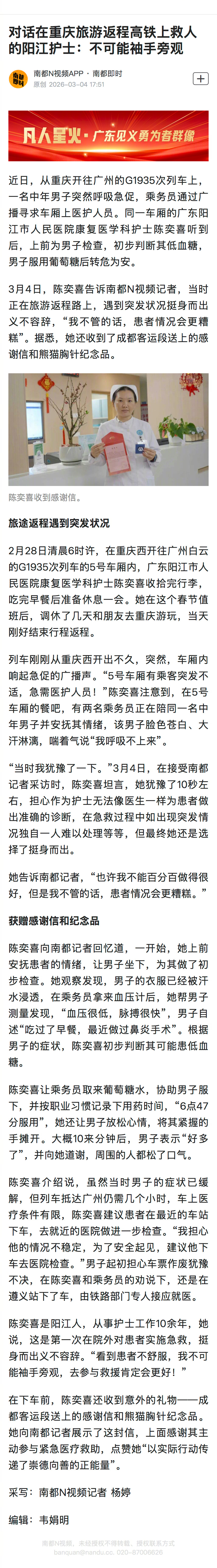 #阳江护士高铁救人称不可能袖手旁观#【对话在重庆旅游返程高铁上救人的阳江护士:不可能袖手旁观】#高铁乘务员致谢阳江护士善举#近日,在从重庆开往广州的 G1935 次列车上,一名中年男子突发呼吸急促,乘务员立刻通过广播寻找车厢内的医护人员。同在 5 号车厢的广东阳江市人民医院康复医学科护士陈奕喜听到后,当即上前对男子进行检查,初步判断其为低血糖,男子服用葡萄糖水后成功转危为安。