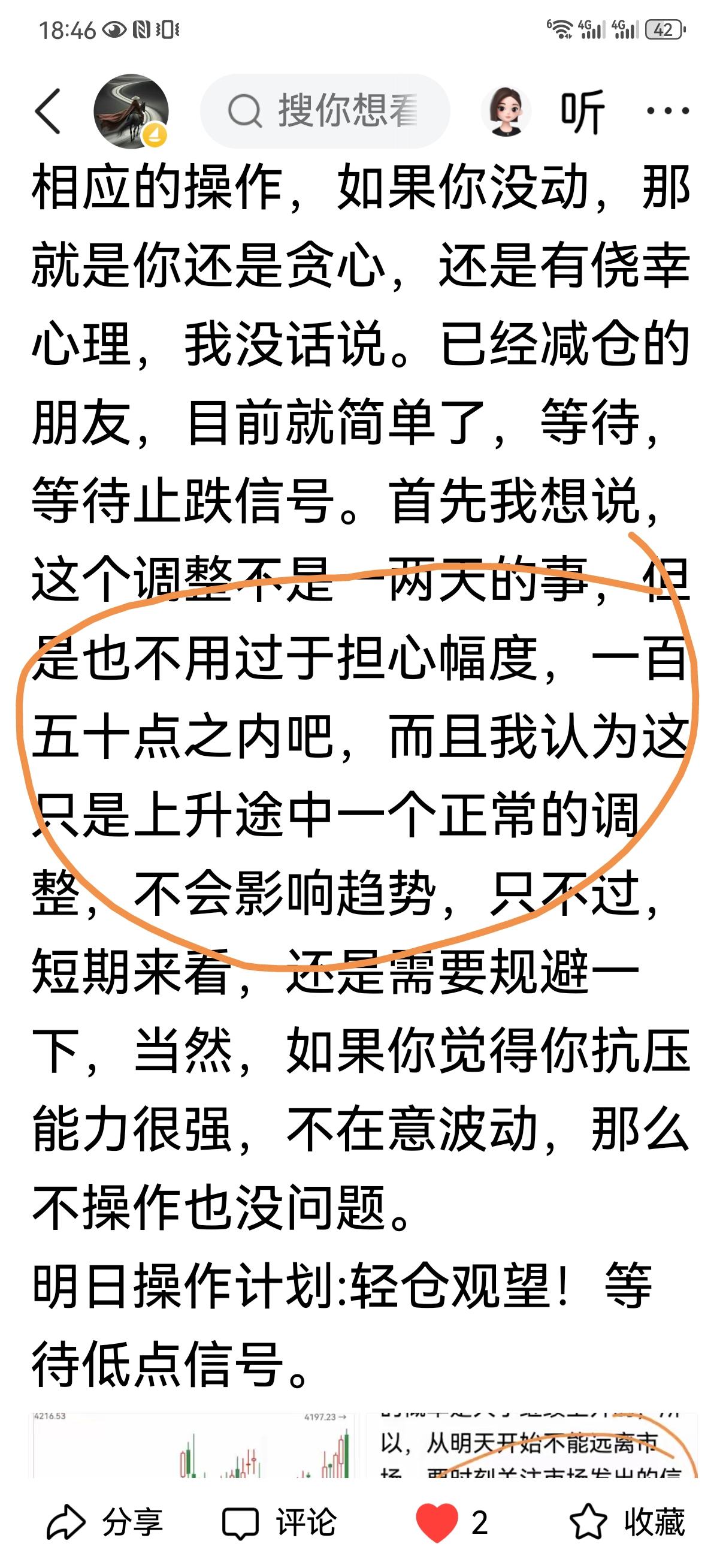 3月5日操盘笔记: 今天又一根中阴线,盘中一度跌了近七十点,当然相对于日韩市场,A股还算不错的。我说的是今天的走势,其实从平衡的角度,日韩比我们跌得多也是正常,人家涨得也多啊。市场就是这样,有传导性的,互相影响。两天跌了一百一十点,最多的时候总共跌了一百三十多点,前几天说我判断这次调整大概在一百五十点,经过两天的急跌大部分空间已经完成了,当然还没有达到150点,我认为后面大幅杀跌的情况不会持续,应该是震荡走低探底,比如说从急跌变成缓跌,中间也会有反弹,用时间来消化调整周期。而且我今天白天说,我觉得券商板块差不多了,不知道怎么就引起了一些人的恼羞成怒[捂脸][捂脸]大概是套久了心态崩了或者是这个位置实在忍不住割了,所以是见不得券商涨的[大笑][大笑]但是市场不会因为可怜谁就改变走势。目前操作上其实很简单,我也一直说,别着急抄底,空手接飞刀,首要任务是等大盘降速!等探底企稳信号,然后出手。 明日操作计划: 管住手,等待!