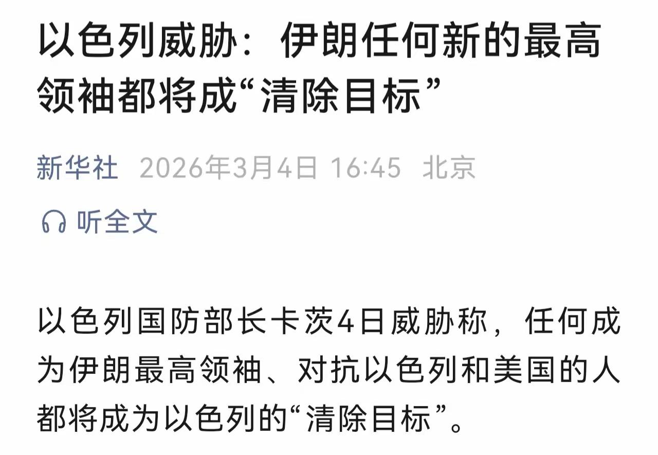 伊朗紧急定选新领袖!以色列防长宣称任何接任者都为打击目标 当地时间3月4日,伊朗官方宣布,因已故最高领袖哈梅内伊遇袭身亡,专家会议正抓紧确定新任最高领袖人选,哈梅内伊次子穆杰塔巴被视为热门人选。 就在伊朗新领导人即将确定的关键节点,以色列防长公然威胁:任何接任伊朗最高领袖者,都将成为打击目标。强硬态度直接拉满。 伊朗方面则多次明确表态:拒绝与美谈判,想打多久就打多久,并以“存亡之战”的姿态全力应对,近期已连续对美军基地和以色列目标实施了16轮导弹打击。而美国内部也出现微妙分歧,副总统万斯对此次军事行动长时间沉默,与共和党高层公开支持形成明显反差。 一边是战时权力交接,一边是外部极限施压,中东局势已走到无谈判、无退路、无缓和的高危临界点。 战争一旦全面升级,没有一方能全身而退。