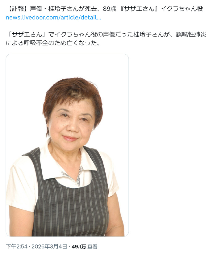 聪明的一休小叶子声优去世 《聪明的一休》小叶子的声优桂玲子因病去世,享年89岁。