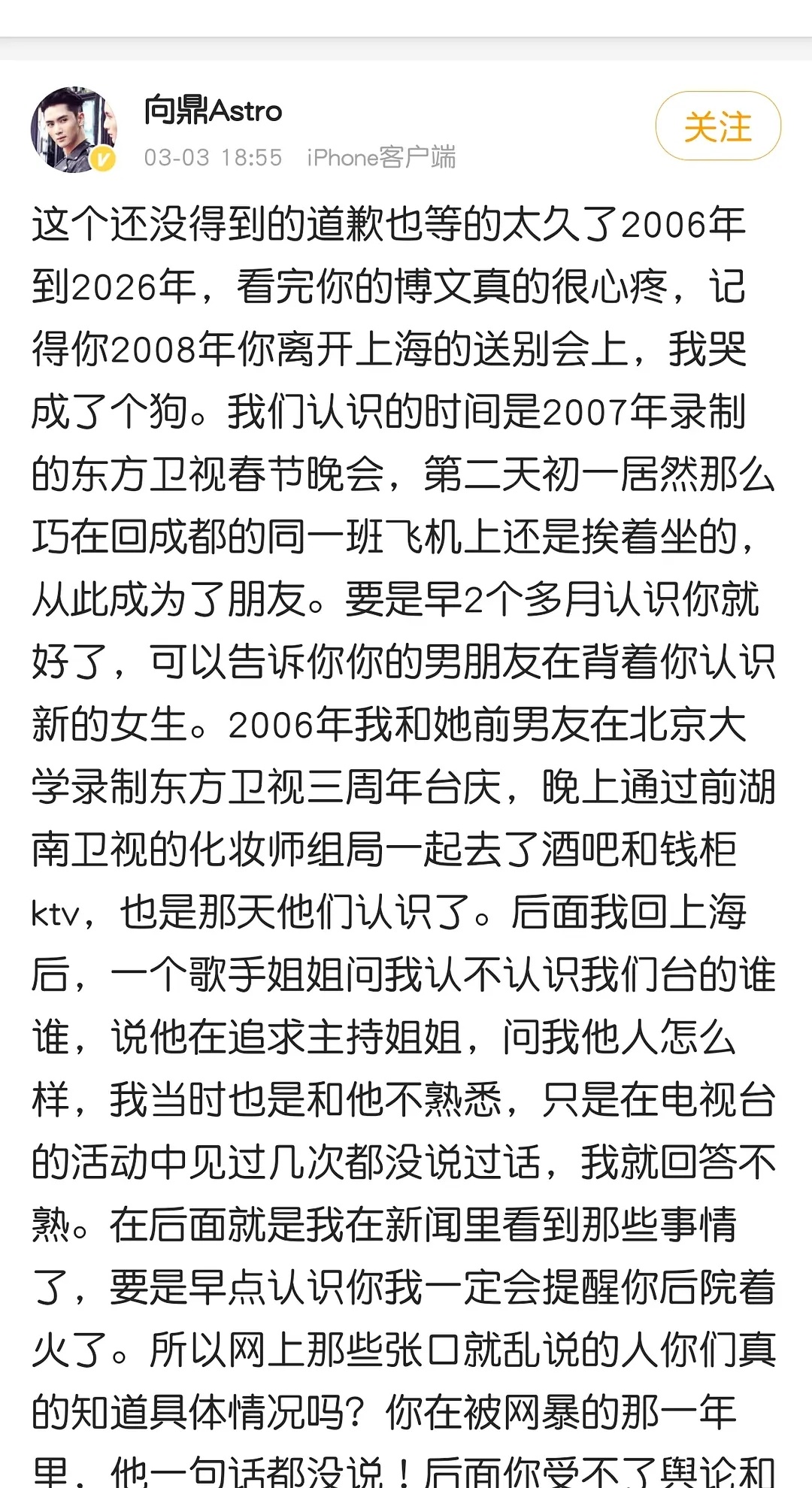 又有人站出来🔨张杰了,这人是06加油好男儿选手向鼎,喜欢早期选秀节目的观众对这个名字不会太陌生。向鼎说06年他和张杰去KTV,就有人和他说张杰在追谢娜,而这个时候张杰和段曦还没分手而段曦对此也不知情,他因为那时候和段曦和张杰都不熟所以没理会,后来认识了段曦觉得段曦是个好女孩,因此很内疚没有早点认识段曦,不然就可以早点提醒段曦了。