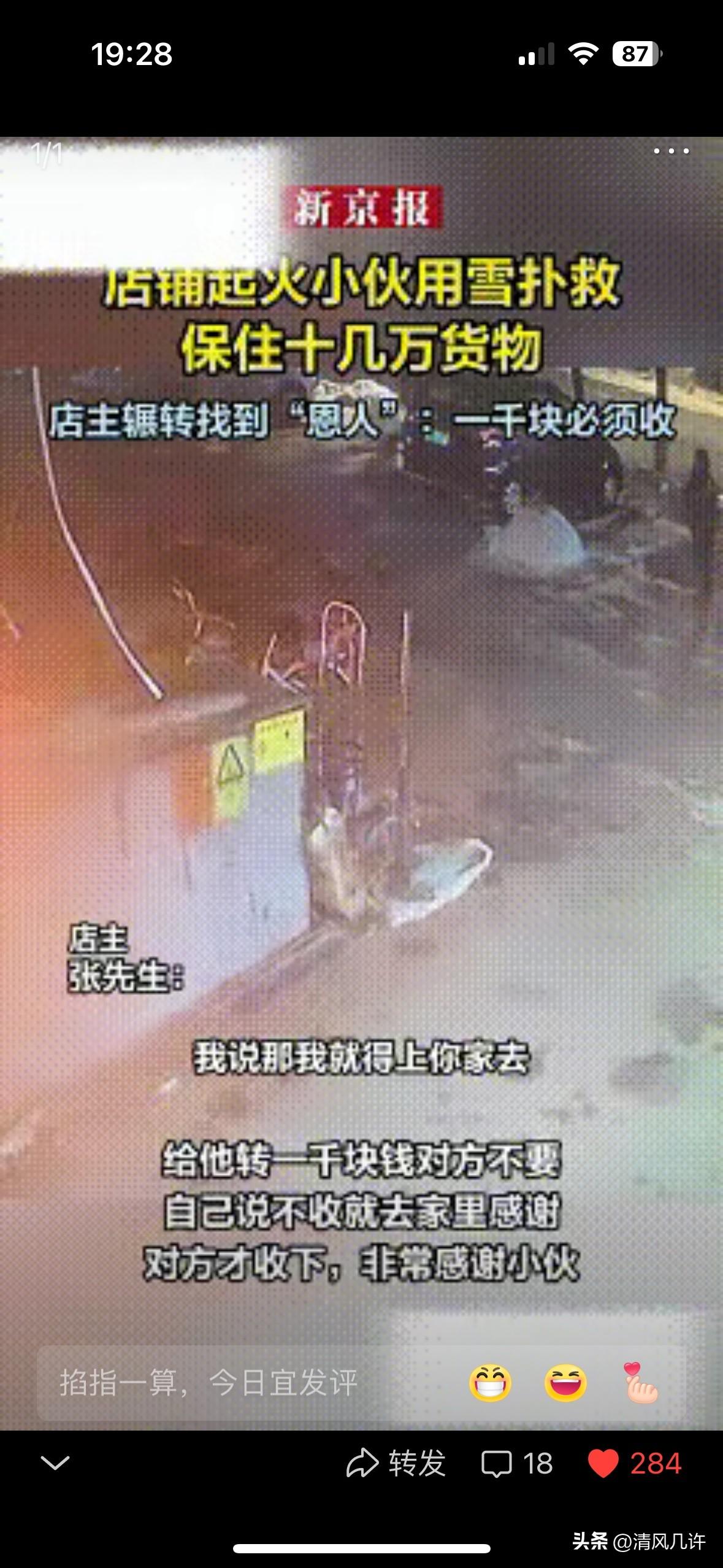 被人民日报赞了!黑龙江一个小孩路过这家店铺时,一转头突然发现身后的店铺着了火,情急之下小孩直接徒手抓雪灭火,后来又找到一个桶子,将其装满雪继续灭火。 那是2月24日的晚上,十点多的饶河街头还飘着细碎的雪粒,气温低到能把人鼻子冻得通红。 27岁的沈阳小伙刚和朋友吃完烧烤,正准备拦出租车离开,眼角余光扫到马路对面的店铺门口,窜起了一人多高的火舌。 他没多想,拉着朋友就冲了过去,朋友反应快,立刻掏出手机拨打119,他则盯着路边堆着的积雪,直接蹲下身,徒手抓起一把雪就往火堆里砸。雪粒在掌心瞬间融化成冰水,顺着指缝往下淌,冻得他指尖发麻,可他根本顾不上这些,一把接一把地往火里扔雪,直到看见旁边有个空桶,才赶紧抓过来,装满雪后狠狠泼向火势最旺的地方。 邻居们听到动静也赶了过来,有人递来铁锹,有人端来水盆,几个人围着火点忙活,没几分钟就把明火压了下去。等确认火不会复燃,他和朋友悄悄转身离开,连名字都没留下。 店主张先生是第二天才知道这件事的。当时他回到店里,发现门口的四个轮胎被烧得焦黑,泡沫箱也成了一堆灰烬,心里咯噔一下,赶紧调看监控。 屏幕里的画面让他瞬间红了眼:那个陌生小伙蹲在雪地里,双手在火和雪之间来回切换,动作快得像一阵风,而他店里的货物,全是易燃的木制品,十几万的手串和原料就堆在离火点不到两米的地方。 要是再晚几分钟,火舌舔到店里的货架,这些心血就会化为灰烬,那可是他和家人攒了好几年的家底。他越想越后怕,也越感动,当即决定找到这个小伙,当面说声谢谢。 起初张先生以为小伙是当地的学生,托人在学校里打听了好几天,却没半点消息。他又把监控片段剪成视频,发到了本地的社交平台,配文“寻找这位雪地英雄,我要当面感谢他”。视频很快传开,有人认出了小伙的身影,说他是沈阳来的,过年到女朋友家走亲戚,当天吃完烧烤就准备返程了。 3月2日,当地一位出租车司机给张先生打来电话,说他拉过这个小伙,知道他住在哪。张先生立刻按照地址找了过去,见到小伙的那一刻,他攥着手机的手都在抖,当场就要转一千块钱过去,说“这是我的一点心意,你必须收下”。 小伙却摆了摆手,说“谁看见都会管,这点小事不值当”,死活不肯收钱。张先生急了,语气也重了起来:“你要是不收,我就天天来你女朋友家登门道谢,直到你收下为止。” 小伙拗不过他,才勉强点了点头,收下了那一千块。后来张先生说,他知道这点钱根本不算什么,可这是他能拿出的最实在的心意,是对这份善意的回应,也是对自己良心的交代。 这件事被人民日报点赞后,很快在网上传开了。有人说小伙太傻,零下三十度徒手抓雪,万一被冻伤怎么办;也有人说店主太较真,不就是一千块钱,至于追着人要收吗。 可只有他们自己知道,那双手里抓着的不是雪,是对陌生人的担当;那一千块里装着的不是钱,是对救命之恩的铭记。在这个快节奏的时代,太多人习惯了“事不关己高高挂起”,可总有一些人,会在别人需要的时候,毫不犹豫地伸出手,用最朴素的行动,温暖着整个冬天。 各位读者你们怎么看?欢迎在评论区讨论。