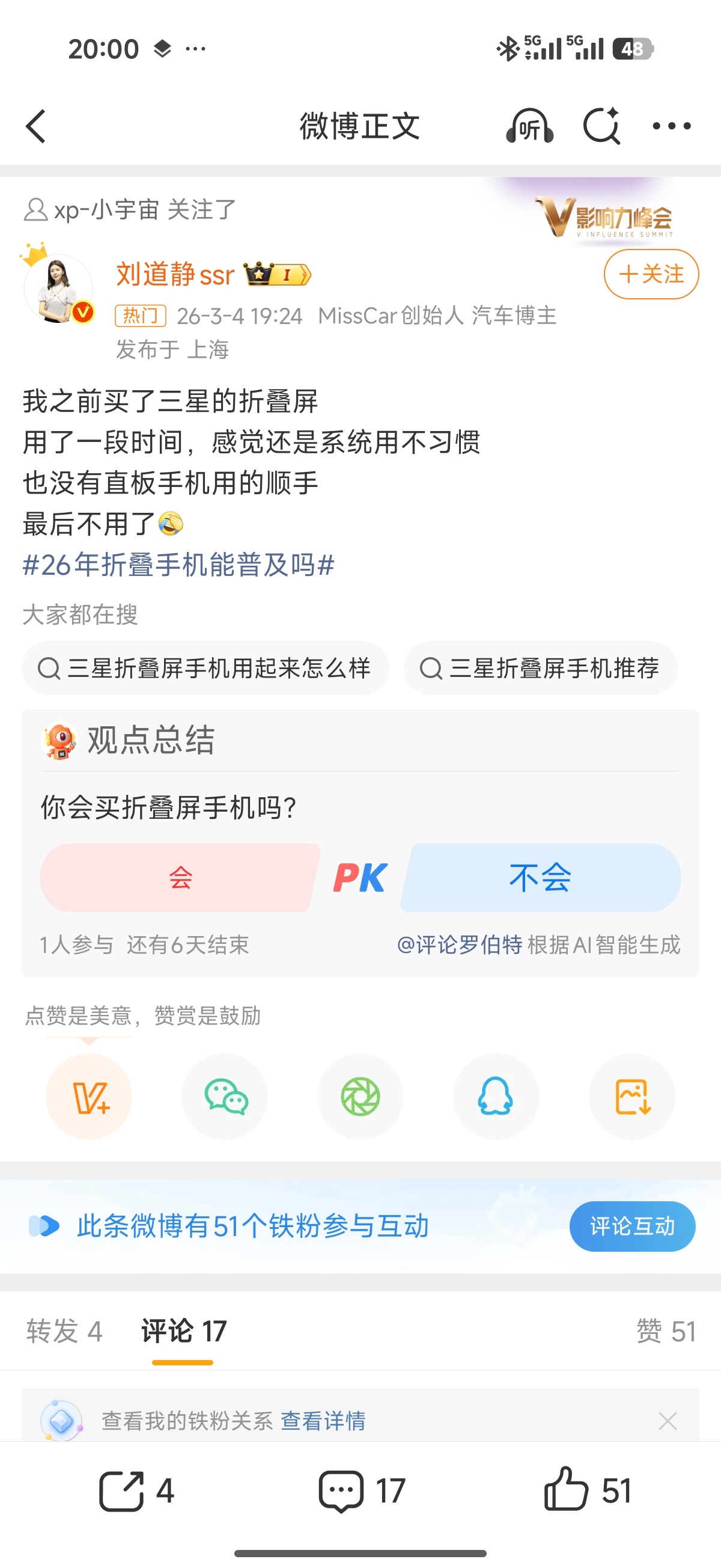 折叠屏的大屏体验看视频,看表格,看图片很好,但是日常大部分时候还是折叠起来用的,70%的时间还是直板机用。所以就看用户需求了。不是太经常看视频,看表格啥的就没那么需要。