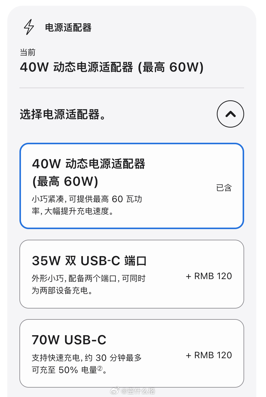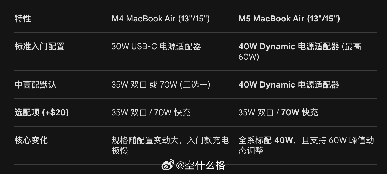 准备买 M5 MacBook Air 的看过来,包装盒内的充电头统一成了 40W 动态(峰值60W),也可以加钱 120 元换成 35W 双口或者 70W。