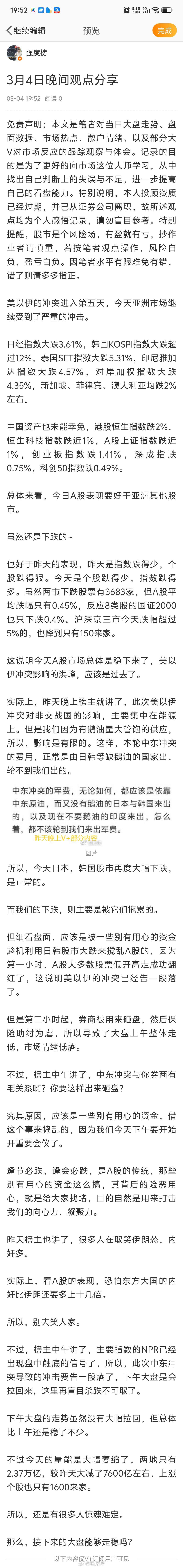 晚间分享股票A股 3月4日晚间观点分享美以伊的冲突进入第五天,今天亚洲市场继续受到了严重的冲击。日经指数大跌3.61%,韩国KOSPI指数大跌超过12%,泰国SET指数大跌5.31%,印尼雅加达指数大跌4.57%,对岸加权指数大跌4.35%,新加坡、菲律宾、澳大利亚均跌2%左右。中国资产也未能幸免,港股恒生指数跌2%,恒生科技指数跌近1%,A股上证指数跌近1%,创业板指数跌1.41%,深成指跌0.75%,科创50指数跌0.49%。总体来看,今日A股表现要好于亚洲其他股市。