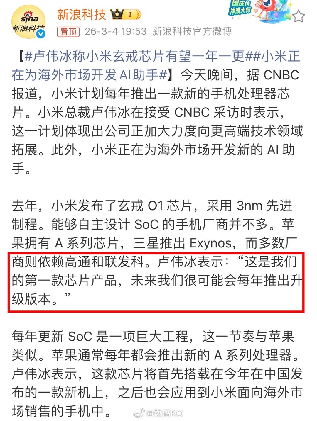 卢总采访透露:小米玄戒芯片会推出新的版本,每年都会升级,此外小米计划今年首次在一