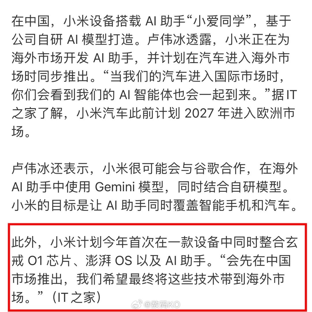 卢总采访透露:小米玄戒芯片会推出新的版本,每年都会升级,此外小米计划今年首次在一款设备中同时整合玄我01芯片、澎深OS以及 Al助手,会在中国市场率先推出。