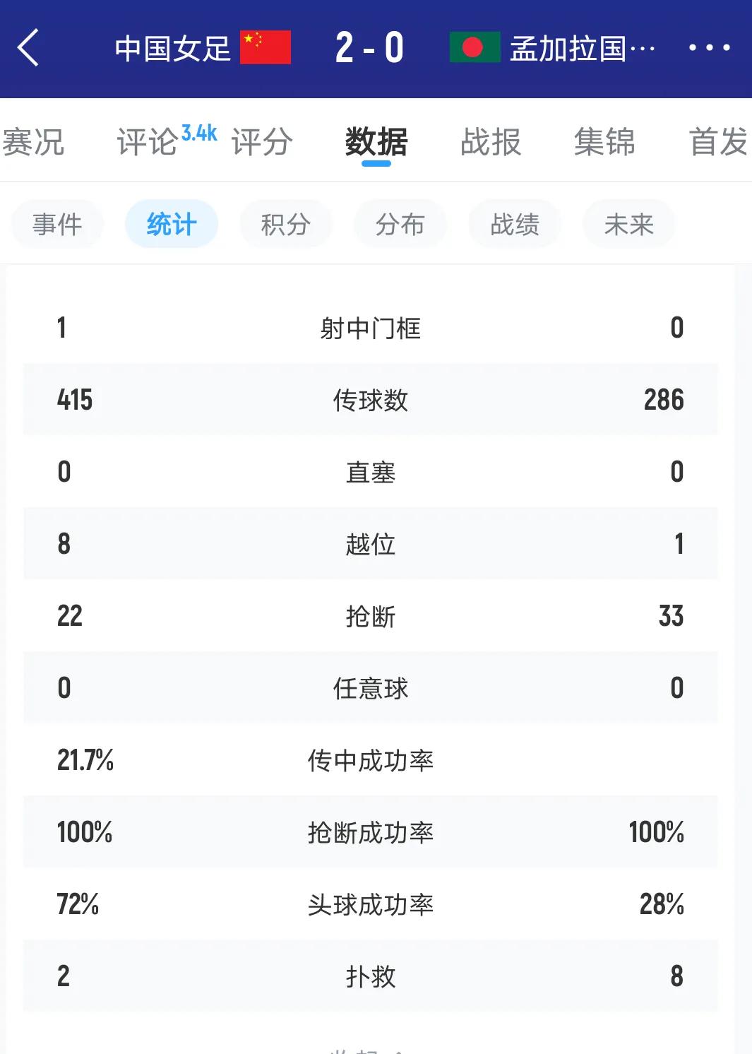 女足亚洲杯,中国队终于2:0艰难战胜亚洲弱旅孟加拉队,是的,你没看错,是2:0,而且还是靠的远射。 从比赛过程看,上半场比赛,中国队踢的比较紧,失误特别多,60%的控球率,传球成功率才73.5%,传跑不合拍,感觉好像是一群陌生人在一起踢球一样。 中场控制不住球,和孟加拉队陷入不断拼身体抢球权的节奏中,孟加拉女足的身高虽然与中国女足差距很大,但是脚下非常快,总是提前把球捅出去,让中国女足踢的很别扭,那一刻感觉她们好像糙哥附体了一样。 中国队的球员感觉好像身体比较疲劳,速度慢,脚下发沉。孟加拉队的球员好像打了鸡血一样,玩命的拼抢,那场面让人不得不佩服,首发平均年龄不到21岁的年轻球队,只输两个,她们可以笑了。 如果中国队以这样的状态来踢剩下的比赛,想进四强都难。亚洲杯结束,换教练吧。不然,中国女足会变成下一个中国男足。