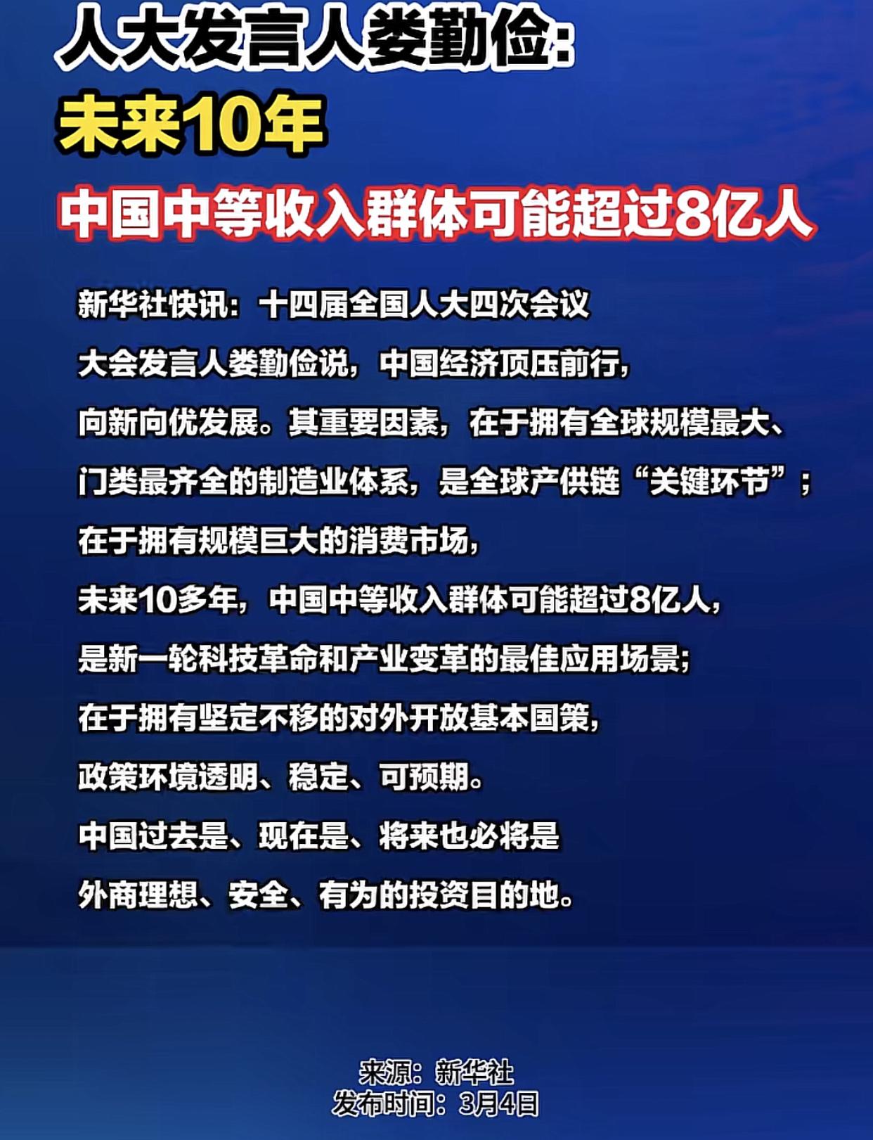 还有什么比这更鼓舞人的呢:未来10年,中国中等收入群体有可能迈向8亿人! 这意味着囯家将更多的资金投入到民生工程,中国正形成全球最大的消费市场,这是从“世界工厂”迈向“世界市场”的关键一跃。如果月薪过万的算是中等收入的话,其实,现在月薪超过一万以上的人有很多。 不说多接触那些多有钱人,稍微多接触一下那些稍微有一点点钱的,比如有房的,父母有社保的,或者他们自己有正常收入和房子,这应该算是中产收入其中的一部分,而且不在少数。未来10年要达到8亿人这个目标,相信国家有这个能力花大力气作保障实现共同富裕。