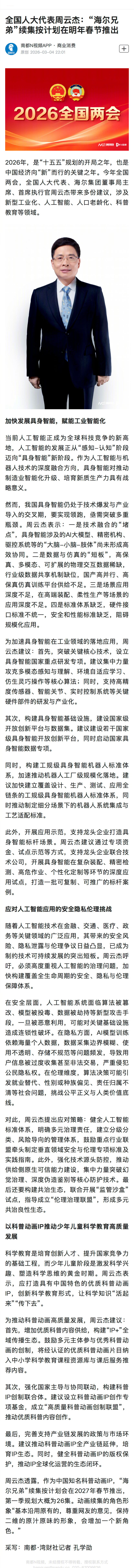 【#海尔兄弟深海奇航定档2027年春节#】#海尔兄弟续集有新角色加入##2026都看两会#全国人大代表、海尔集团董事局主席周云杰在 2026 全国两会上透露,经典科普动画《海尔兄弟》续集按计划将于2027年春节推出,第一季规划26集,主题为“深海奇航”,角色将沿用经典二维形象并新增一位角色。