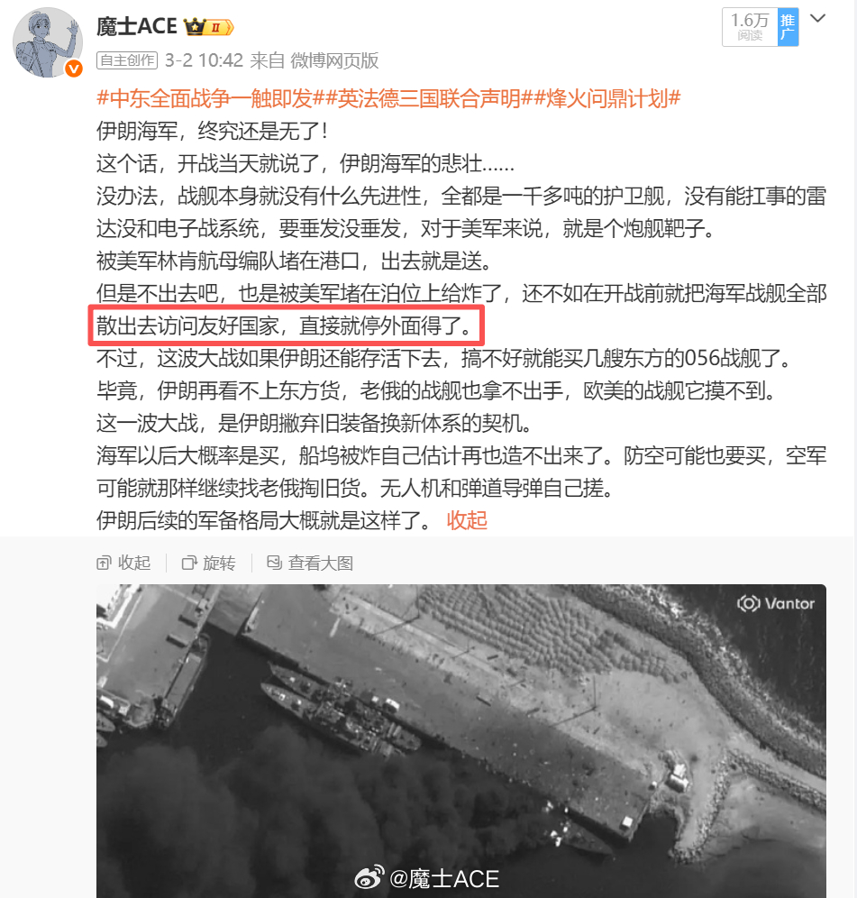 伊朗军舰遭袭101人失踪78人伤烽火问鼎计划伊朗 悲壮——伊朗的战舰,被美军潜艇击沉,成为二战以来美军第一艘鱼雷击沉的战舰。被击沉的是穆杰级护卫舰,“艾瑞斯· 迪纳”号,排水量1500吨,装备4发防空导弹和4发反舰导弹。这艘战舰是在从印度回来的路上被击沉的,被击沉的位置,位于斯里兰卡南部70公里的海域,属于国际海域。基本上无解,这种1500吨的小舰,压根没有什么反潜能力,遇上美军核潜艇只能白给。唉,挺无语,之前都说了,伊朗战舰这个时候就直接去外国访问,直接滞留得了。哪成想,在外面军演的完的战舰还上赶着往回送人头!现在伊朗海军的战舰,基本上都是被堵在泊位上被击沉的,这个方法本身也是正确的,反正军舰被击沉是板上钉钉,还不如避免人员损失。外面的这样的千吨级战舰赶回来也没啥用,本土印度洋地区的军舰越少越好。这下损失惨重,战舰被美军潜艇击沉,100多人失踪,这对于未来重建伊朗海军来说损失更重。而美军在斯里兰卡击沉伊朗战舰,也已经意味着,这已经不是一场仅限于伊朗以色列区域的局部冲突,而是美国和伊朗之间的全面战争。且,美军的潜艇,一直在印度洋附近徘徊。所有地点、所有空间,凡是敌国对立的目标,皆可攻击。这个时候,伊朗也可以发挥主观能动性了——中东的美军可以打,也可以学乌克兰跑到远东用无人机炸俄罗斯战略轰炸机那样,用卡车装无人机到欧洲或者非洲,给它们的战略武器狠狠来两下!