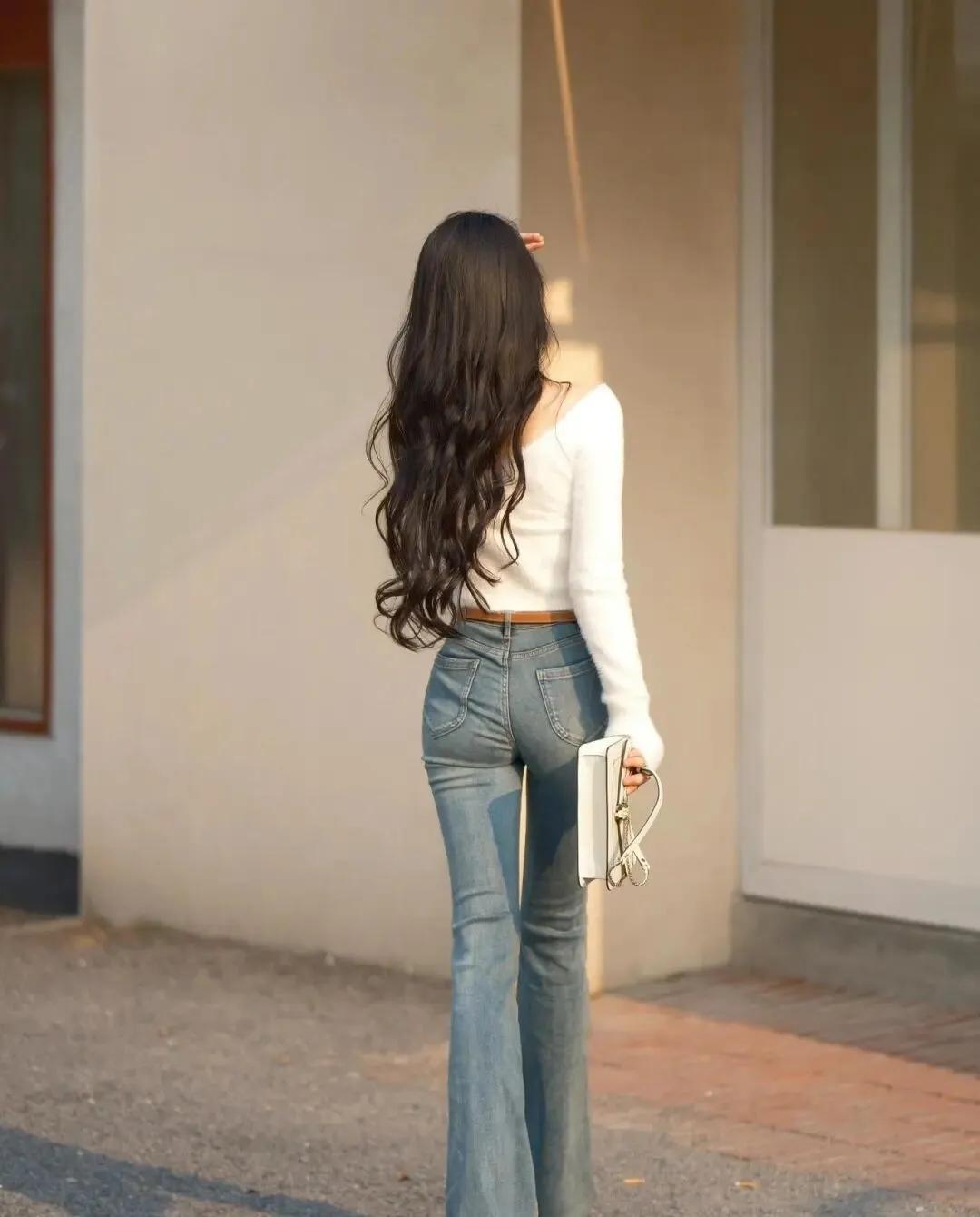 温柔甜美的女孩,白色毛衣与牛仔裤的搭配,简约而时尚。