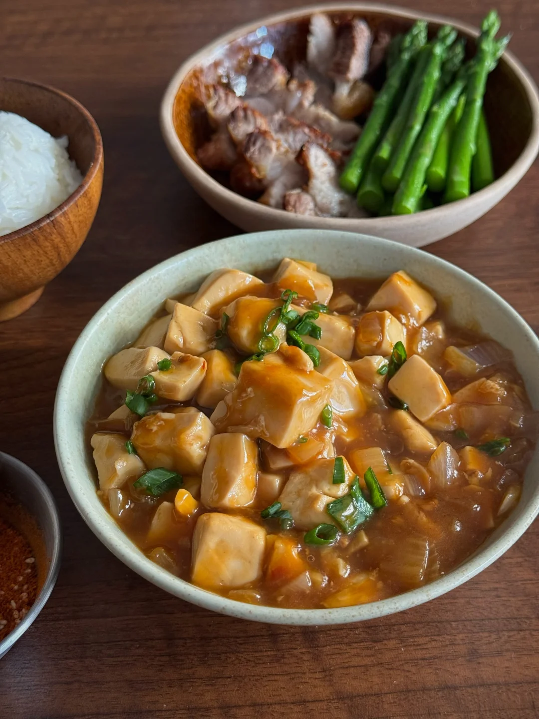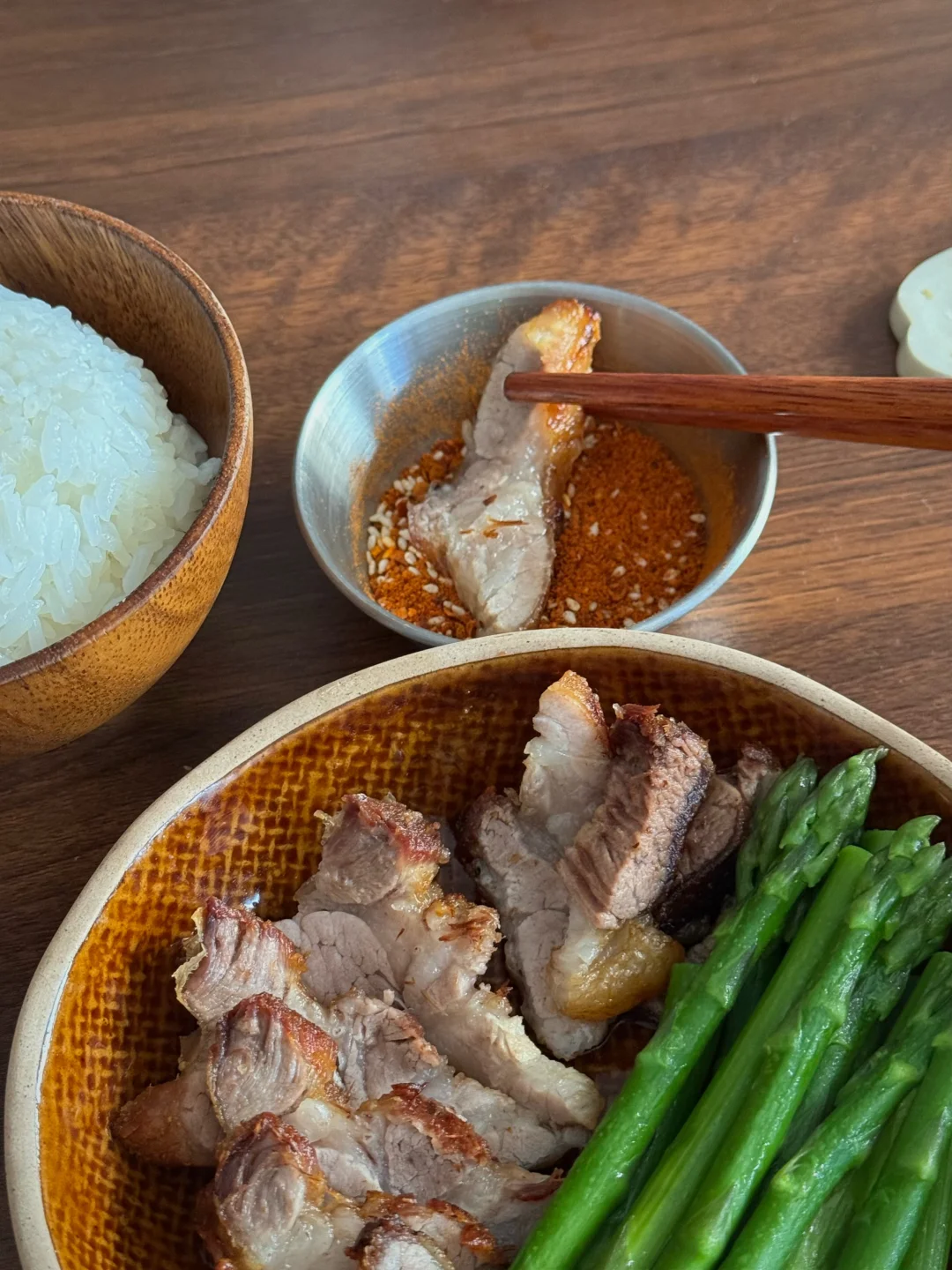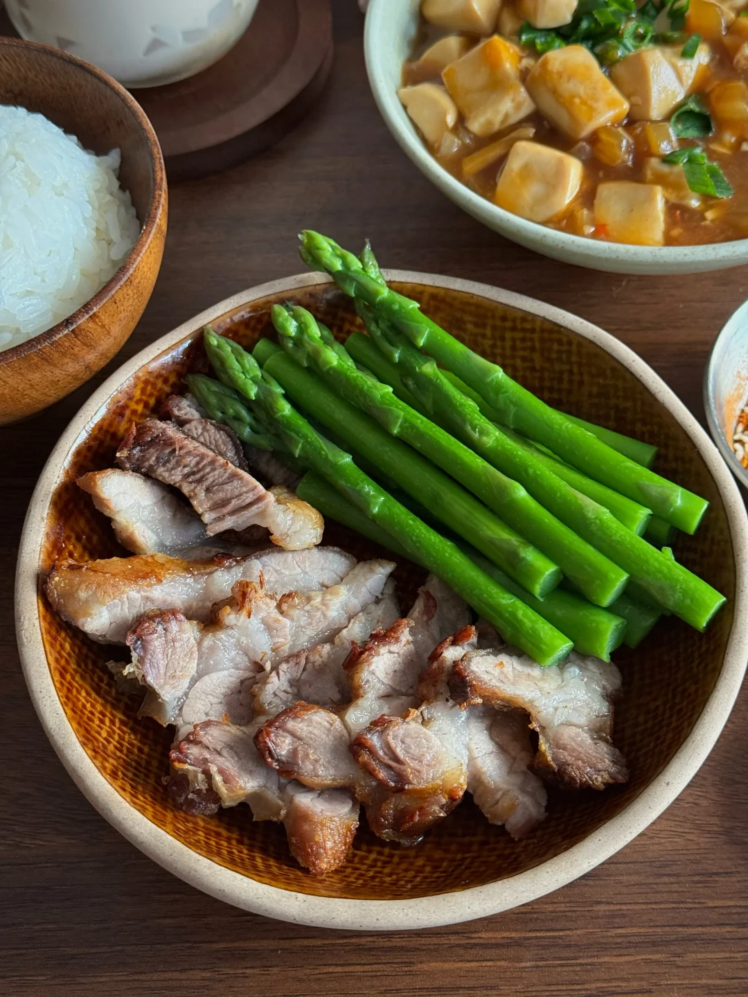 今日份餐桌清单🧾: 🥓焦香入味的煎五花肉+翠绿芦笋 🥢 滑溜溜的酱香豆腐(下饭神器!) 🍚 一碗热腾腾的白米饭 🥤 橙香椰果奶茶 简单的食材有不简单的幸福感,推荐豆腐这样吃,平时吃不了太辣,所以今天这个不是麻婆豆腐,今天的豆腐味道参考了部分酱香饼酱的调味,很好吃哦! 五花肉煎一煎,挑了一块瘦的,避免油脂过多,煎的表面较脆,蘸点烧烤粉就很香。 奶茶也是自制的呢!用的复合橙子香味的红茶包,有放一点冰糖,加牛奶和多多的椰果,甜甜的、香香的,超满足!
