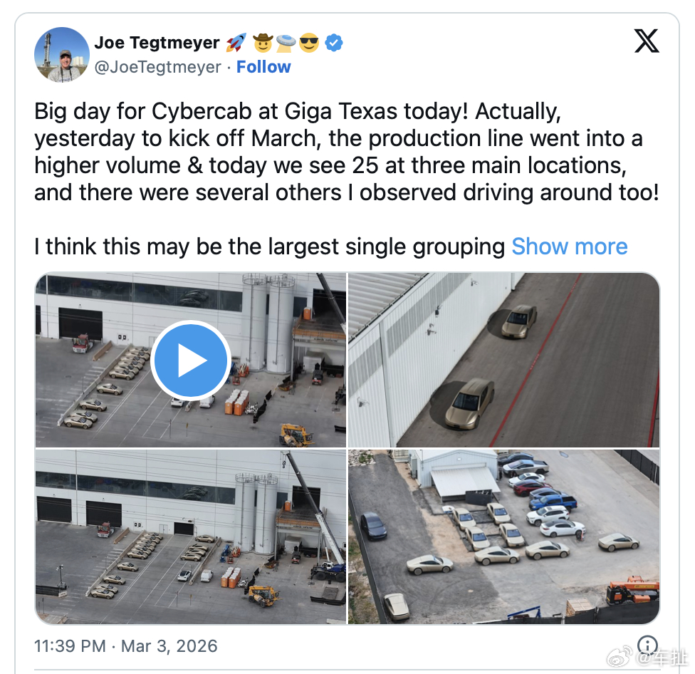首台量产版Cybercab已于2月中旬下线,比原计划的4月提前了数周。业内人士认为,3月初能在厂区内看到数十辆Cybercab,表明特斯拉已经过渡到了更大批量的测试生产阶段。