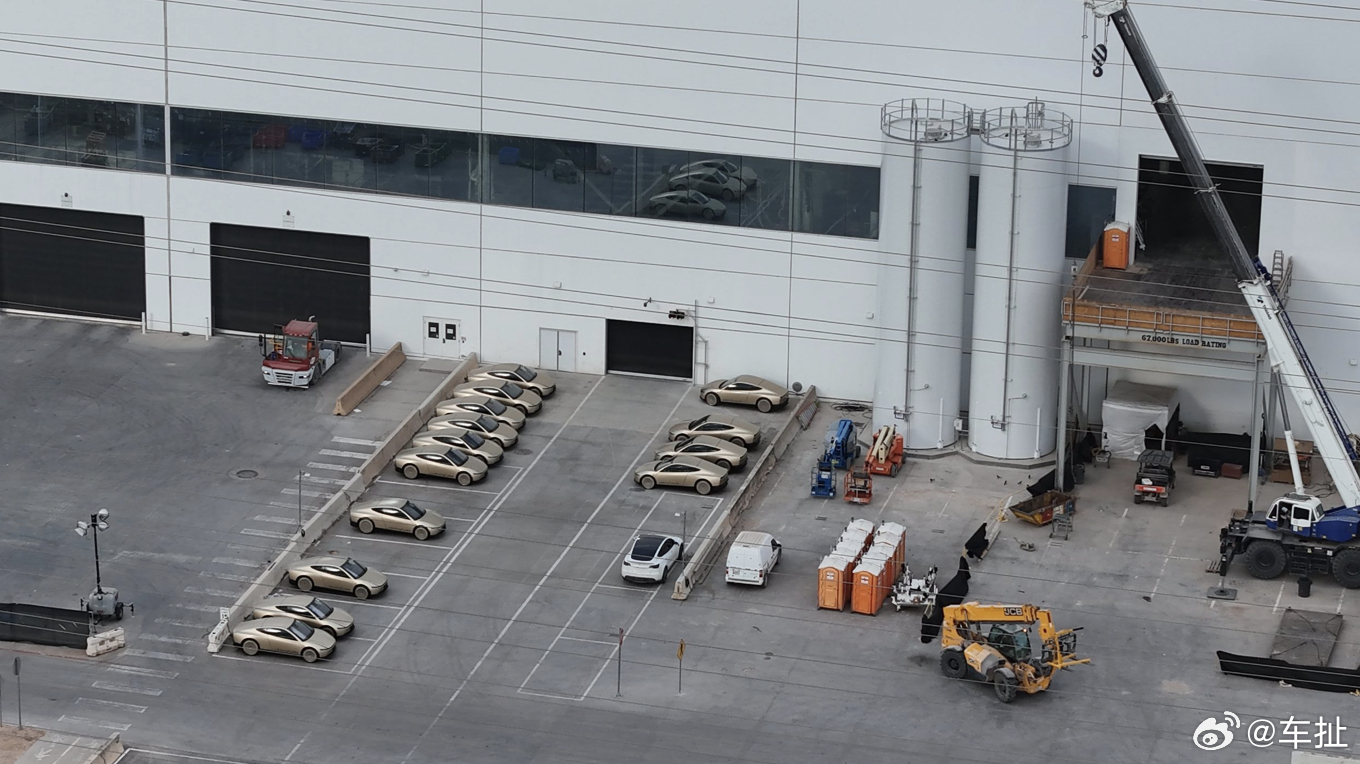 画面拍摄到了25辆样车,14辆Cybercab停在工厂出口外,还有9辆样车停在碰撞测试设施中,还有两辆在生产线进行终检。此外还有一些Cybercab在厂区内行驶,可能在进行实际路况测试。