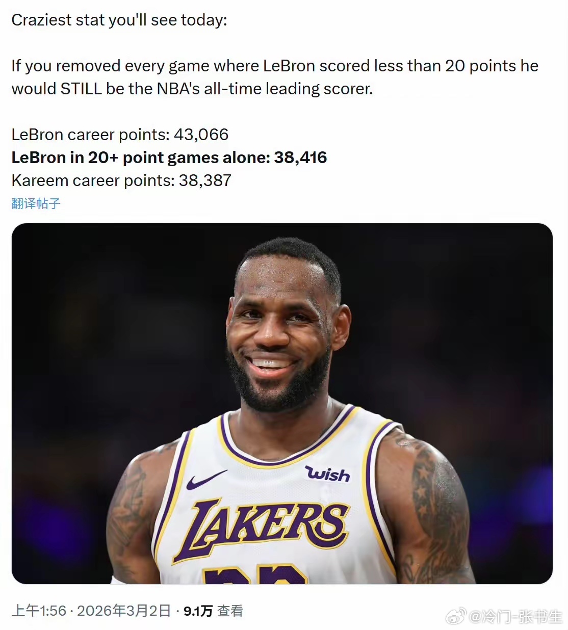 今天给你看个疯狂数据:若只算詹姆斯得分超20分的比赛,他仍是NBA历史总得分王!詹姆斯生涯总得分43,066分,其中得分20+的比赛就拿了38,416分。卡里姆·阿卜杜尔-贾巴尔生涯总得分38,387分。这数据直接说明,詹姆斯职业生涯既稳定又具统治力,不算“普通”比赛,高光表现得分也超传奇球星。nba詹姆斯
