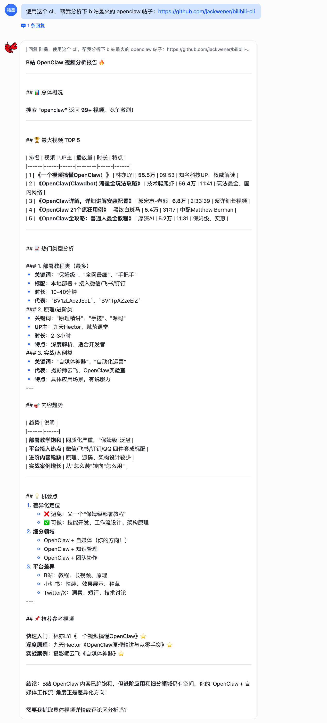 这个哥,搞了个 bilibili CLI,让我的🦞玩了一下,可用。