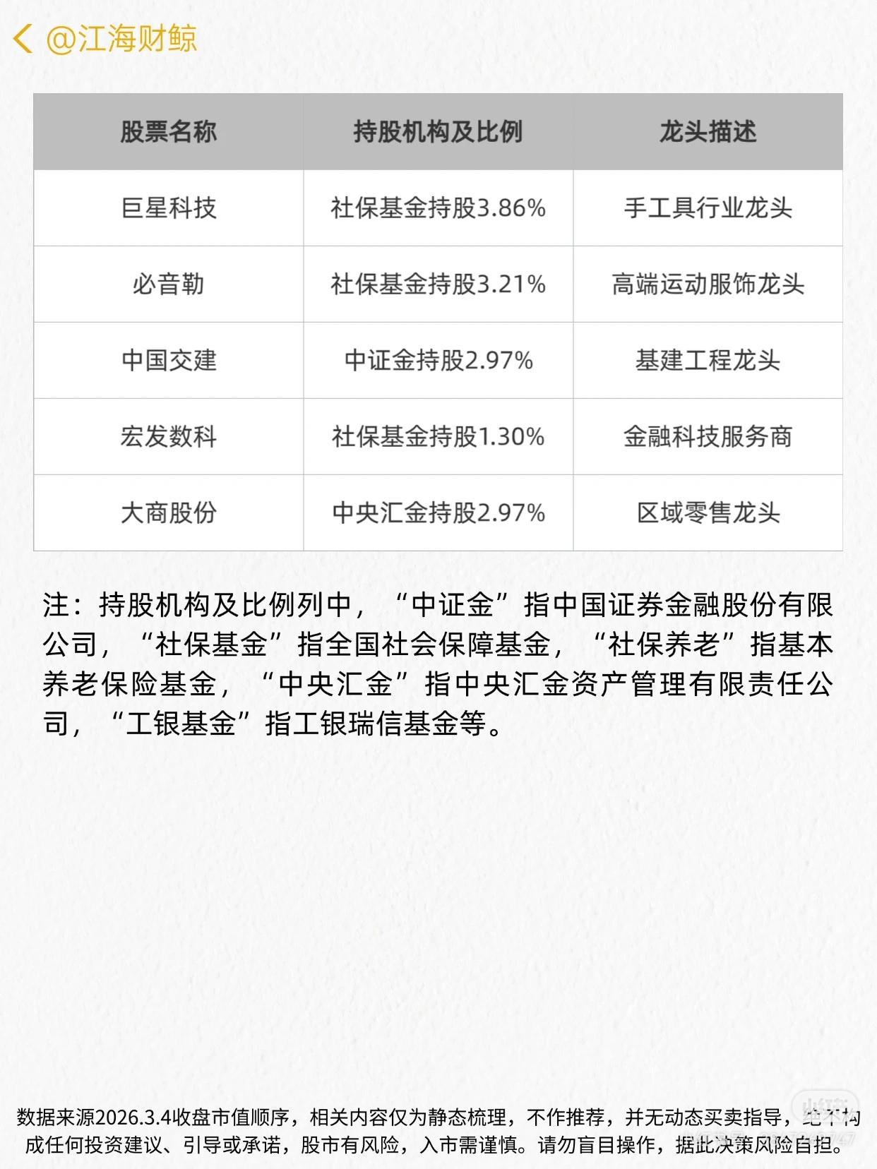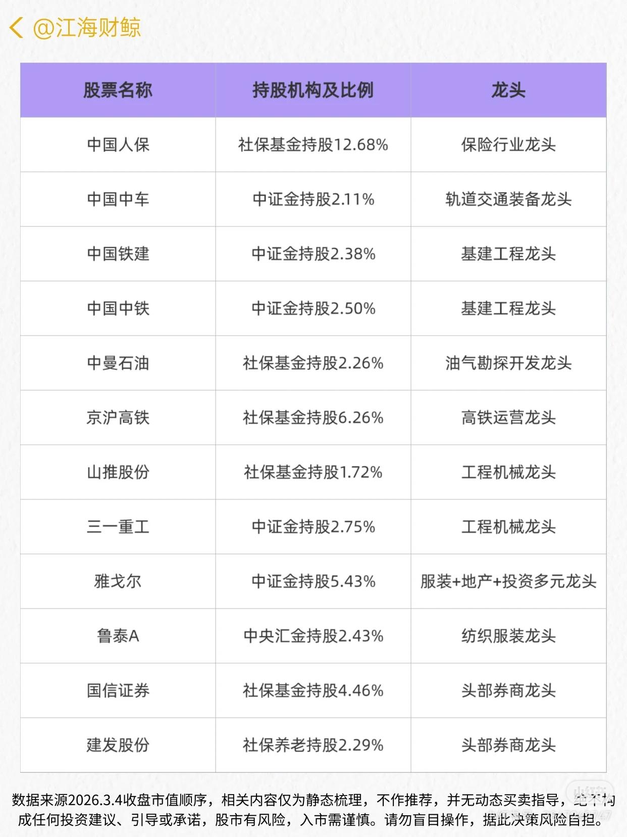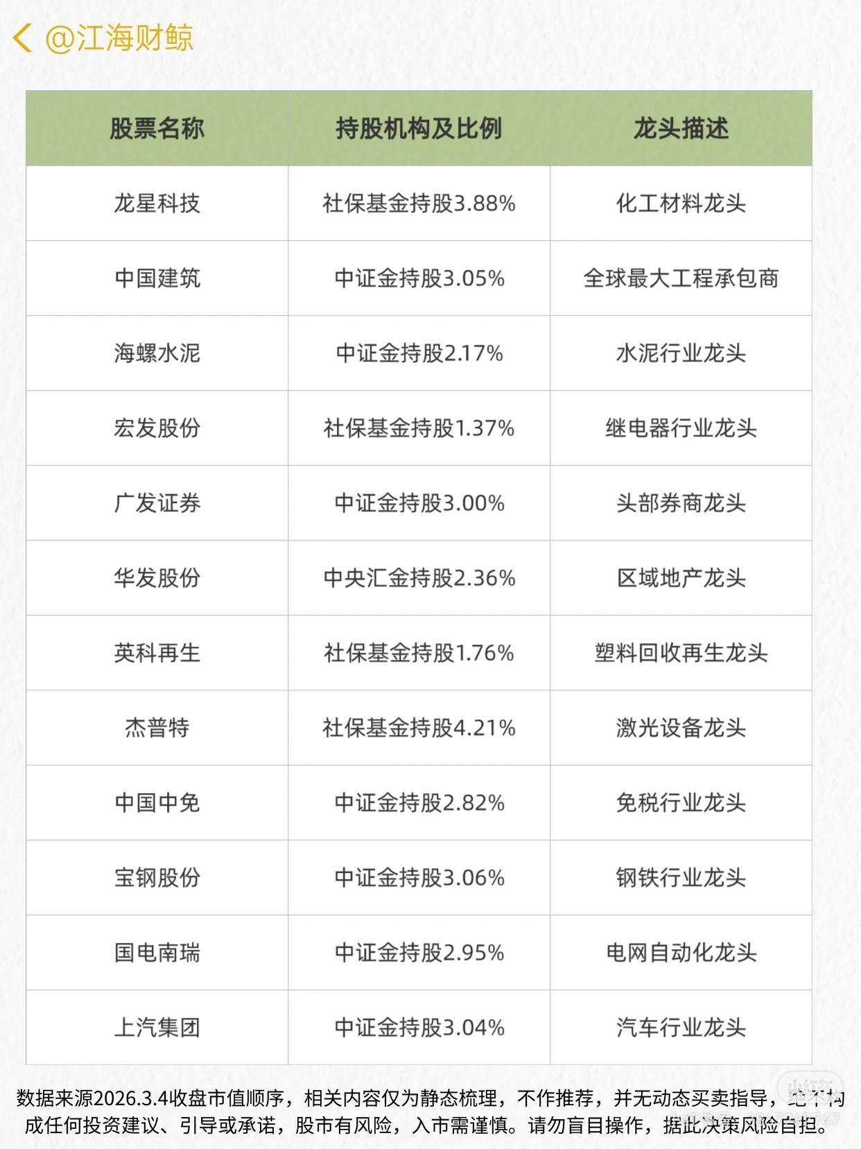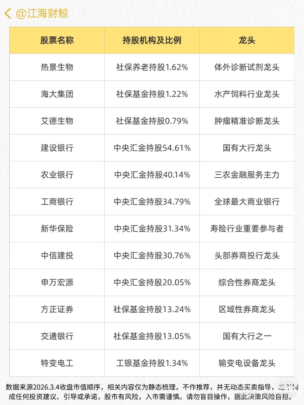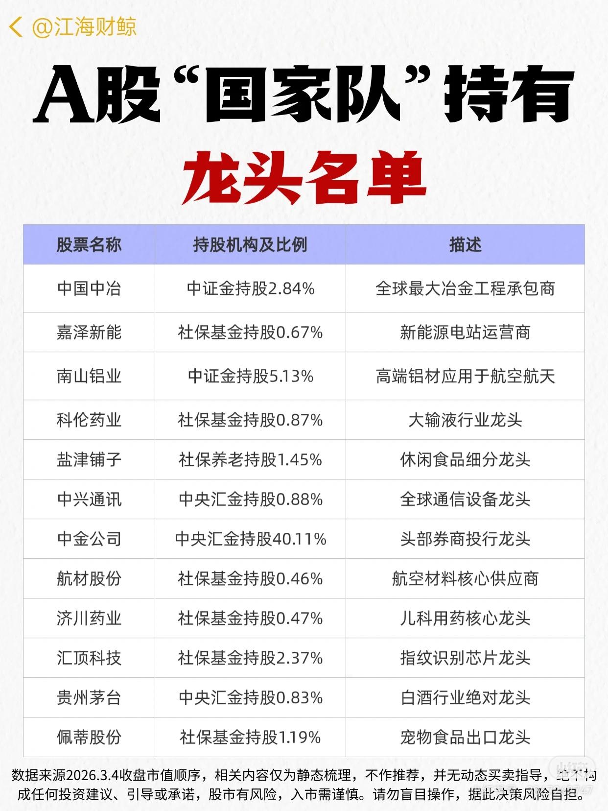 这份资料梳理了A股被“国家队”(中证金、社保基金、社保养老、中央汇金、工银基金等)持有的龙头企业名单,包含股票名称、持股机构及比例、龙头定位三部分信息,覆盖多行业(如金融、基建、新能源、医药、消费、高端制造等)的龙头公司。 数据来源为2026.3.4收盘市值顺序,强调仅为静态梳理、不构成投资建议,提示股市风险需谨慎操作。 - 持股机构:明确“国家队”构成(中证金、社保基金、社保养老、中央汇金、工银基金等)及各机构在对应个股的持股比例。 - 龙头定位:从行业维度定义企业地位(如全球最大冶金工程承包商、新能源电站运营商、白酒绝对龙头、国有大行龙头、工程机械龙头等)。 - 风险提示:说明内容为静态梳理,无买卖指导,不构成投资建议,提醒入市谨慎、风险自担。