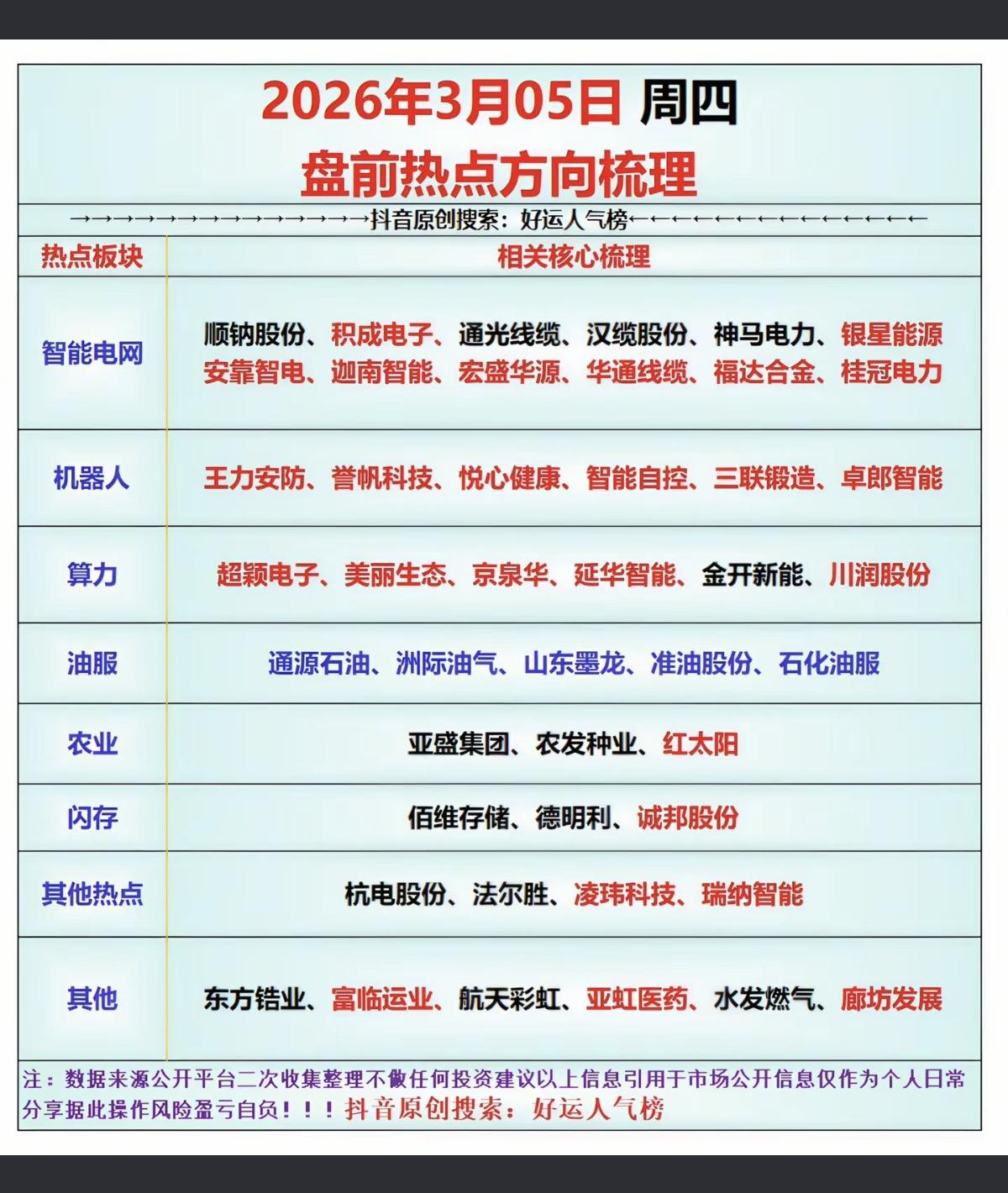 3.5周四 市场热点方向+投资逻辑! 1.智能电网 2.机器人 3.算力硬件 4.油服设备 5.农业,闪存