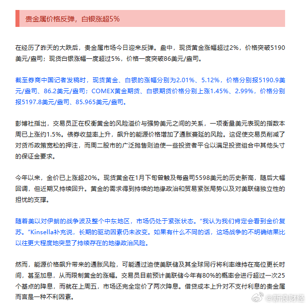 黄金、白银价格也大幅反弹。现货黄金盘中涨幅超过2%,现货白银涨幅超过5%。基本金属普涨,伦锡涨近6%,伦镍涨近3%;伦铝涨3.5%,价格创2022年以来最高,此前巴林铝业(Alba)宣布遭遇不可抗力,将影响其供应合同履行。(券商中国)