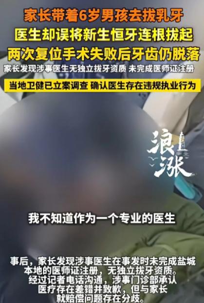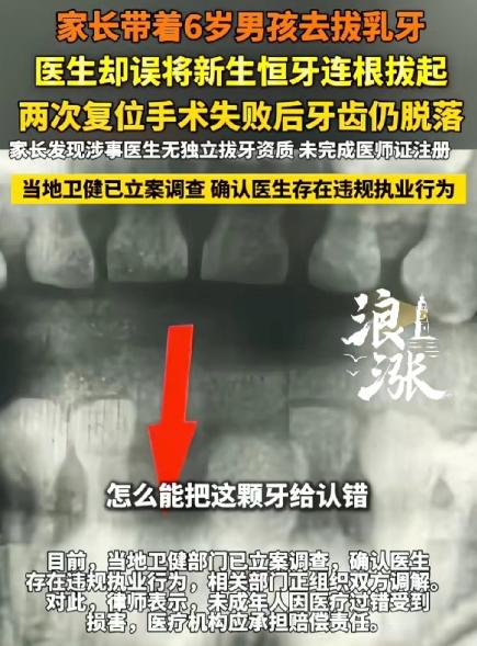 医德何在?江苏盐城,母亲带6岁儿子去口腔医院拔乳牙,不知道是粗心大意还是理解有误,医生竟然把孩子新长出的两颗恒牙连根拔起。确诊拔错牙后,医生先后两次给孩子进行复位手术,结果两次手术都失败,导致错过了最佳治疗时机,这两颗恒牙也很可能无法保住。事后,母亲才得知,该医生并不具备拔牙资质,医生有错不用说,但孩子的恒牙到底该怎么办? 本来就是件再普通不过的小事,六岁孩子乳牙没按时掉,新牙已经冒头,妈妈想着赶紧带孩子去口腔门诊拔掉乳牙,别影响新牙长整齐,谁能料到,这一去,直接毁了孩子的两颗恒牙。 那天,这位妈妈带着孩子来到江苏盐城的一家口腔门诊部,跟医生反复说清楚,是孩子下面的两颗乳牙滞留,新牙已经长出来了,麻烦医生帮忙拔掉乳牙。医生当时也没多问,简单看了看孩子的口腔,就准备开始操作,全程没拍X光片,也没再跟家长确认具体要拔哪颗牙。 拔牙的过程很快,孩子虽然有点哭闹,但也顺利配合完成了。拔完之后,医生还叮嘱家长,让孩子留观20分钟,没异常就可以回家了,后续注意饮食,别吃太硬太烫的东西。妈妈想着拔牙是小手术,也没多想,观察了一会儿就带着孩子回了家。 可回家没多久,妈妈给孩子漱口的时候,突然发现不对劲——孩子新长出来的两颗恒牙不见了,被拔掉的竟然是刚冒头的恒牙,而原本要拔的乳牙,还好好地长在嘴里。那一刻,妈妈瞬间慌了神,赶紧又带着孩子赶回了那家口腔门诊部,找医生问清楚情况。 面对家长的质问,医生一开始还辩解,说自己没拔错,是家长没说清楚。直到妈妈指着孩子嘴里的乳牙,又对比了拔掉的牙齿,医生才勉强承认,可能是自己一时粗心,看错了牙齿,误把恒牙当成乳牙拔了。随后,门诊部给孩子做了CT检查,确诊就是拔错了牙,而且是两颗恒牙被连根拔起。 医生说,现在唯一的办法就是尽快做复位手术,把拔掉的恒牙重新植回牙槽窝,或许还有保住的可能。家长虽然又气又急,但为了孩子的牙齿,只能选择相信医生,同意进行复位手术。可谁能想到,第一次复位手术后没几天,植回去的恒牙就脱落了。 医生又说,再试一次,第二次手术一定会做好,还承诺会尽力保住孩子的牙齿。家长抱着最后一丝希望,同意了第二次手术。可命运似乎跟这个孩子开了个残忍的玩笑,第二次复位手术依然失败了,恒牙再次脱落。 这时候,最佳的治疗时机已经错过了——要知道,恒牙被拔除后,最佳的再植时间不超过30分钟,超过2小时后,再植的成功率就会大幅下降,超过3小时基本就不考虑再植了,而两次手术的折腾,彻底耽误了最关键的救治时间。 看着孩子空荡荡的牙床,妈妈既心疼又愤怒,她开始追问医生的资质,想知道为什么这么简单的拔牙手术,会出现这么严重的失误。这一问,又一个让她崩溃的消息传来:这位给孩子拔牙的医生,根本不具备独立拔牙资质。 后来经过核实,这位医生虽然持有医师资格证,但并没有在盐城本地完成执业注册,按照我国相关规定,医师经注册后,才能在对应的医疗机构从事诊疗业务,无资质或未注册就独立开展拔牙操作,属于违规执业,甚至可能构成非法行医。更让家长气愤的是,门诊部明明知道这位医生没有本地注册资质,还让他独立接诊、开展拔牙手术,这无疑是对患者生命健康的漠视。 事情发生后,涉事门诊部承认了自己的医疗差错,也向家长道了歉,但在赔偿问题上,双方始终谈不拢。门诊部给出了两个赔偿方案,一个是一次性支付2万元,彻底了结此事;另一个是让孩子继续在该门诊部接受治疗,等孩子18岁成年后,再由他们负责种植牙齿。可这两个方案,家长都无法接受。 家长咨询过专业的口腔医生,孩子这两颗恒牙如果无法保住,后续的治疗周期长达十几年,从现在的间隙保持,到成年后的牙齿种植,全部费用至少要十几万元,而且种植牙齿还可能存在排异反应,后续还要不断维护。 2万元的赔偿,连前期的治疗费用都不够;而让孩子继续在这家连拔牙都能出错的门诊部治疗,家长更是不敢相信,谁也不知道十几年后这家门诊部还在不在,更不敢再让孩子冒第二次风险。 现在,当地卫健部门已经对这起事件立案调查,确认涉事医生存在违规执业行为,也在组织医患双方进行调解,但截至目前,双方依然没有达成一致。 最让人揪心的是那个六岁的孩子,他才刚刚开始换牙,两颗恒牙的缺失,不仅会影响他的咀嚼功能和面部发育,还可能影响其他牙齿的生长,甚至会给孩子留下心理阴影。 可能很多家长都觉得,拔乳牙是小事,随便找家口腔门诊就行,可这起事件告诉我们,口腔诊疗无小事,哪怕是简单的拔牙,也容不得半点粗心。 最后想问一句,对于一个六岁的孩子来说,失去两颗恒牙,后续十几年的痛苦和不便,该由谁来承担? 涉事门诊部和医生,除了道歉和敷衍的赔偿方案,还能做些什么来弥补对孩子的伤害?而我们作为家长,又该如何避免类似的悲剧发生在自己孩子身上?欢迎大家在评论区留下自己的看法。