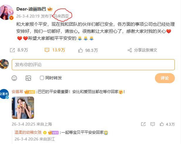 争议了好几天的迪丽热巴迎来了好的消息。 目前迪丽热巴已经是平安了。 本人已经是落地马来西亚,并且在社交平台上发文报平安, 此次的迪丽热巴真的惊艳万分,不少网友堪称迪丽热巴此次的真的是堪比惊险大片,原本上是前往巴黎参加大秀的。 结果呢因为中东的局势问题,所有的航线是全部停运,为此迪丽热巴也是被滞留在迪拜的机场。 这一刻可是把粉丝得心提到了嗓子眼,虽然工作室一直再发布迪丽热巴没有危险,但是一直没有本人露面,很多人并不买账。 如今来看,迪丽热巴亲自发文,并且还带着马来西亚的定位,说明她已经是脱离了危险。 这时候才是真正体会到只有国家才是最安全的。