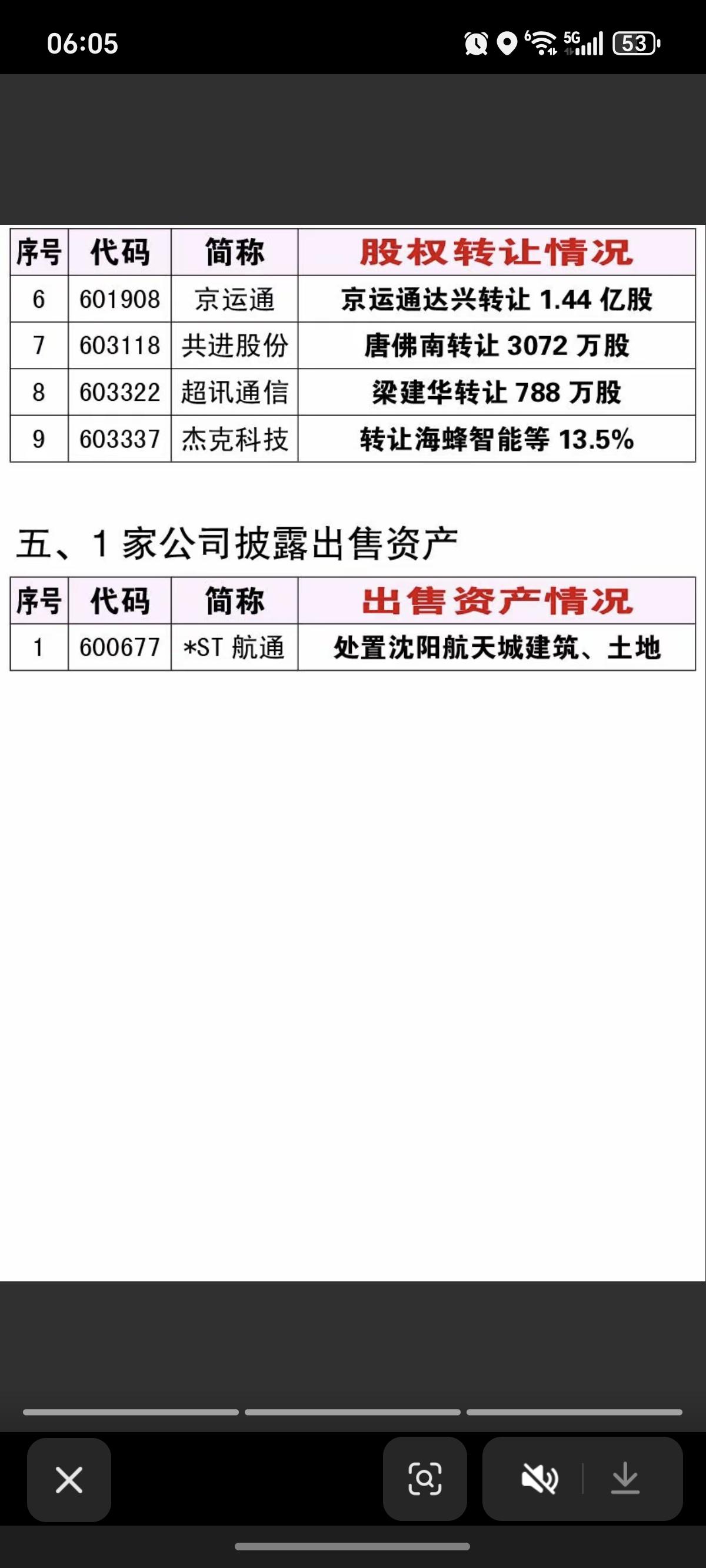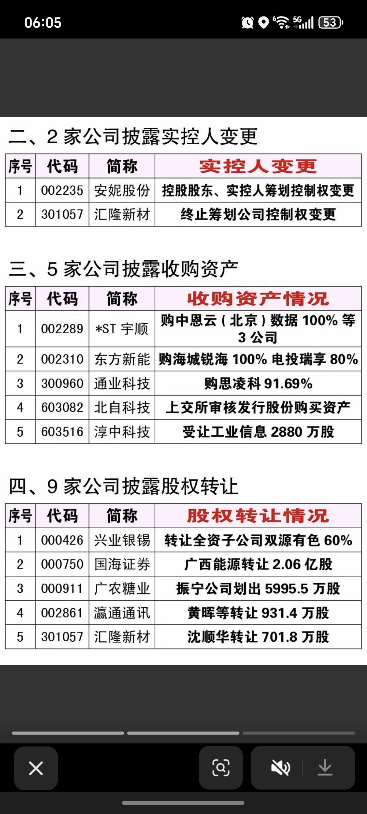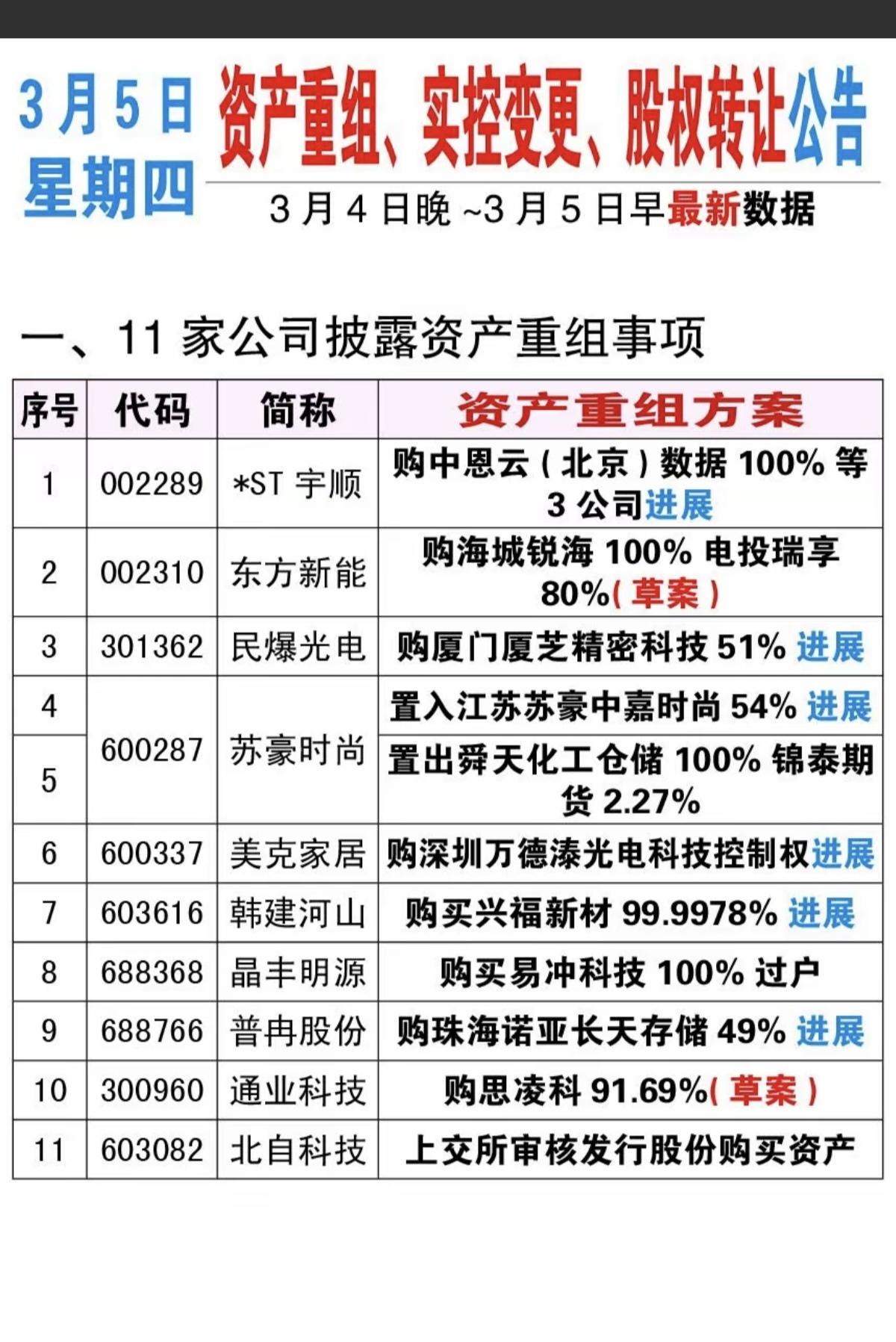 3.5周四 最新:资产重组、股权转让、实控人变更公告! 11家资产重组、9家公司股权转让、5家公司披露收购资产、1家出售资产、2家实控人变更。 1加证券公司,1家有色金属公司股权转让